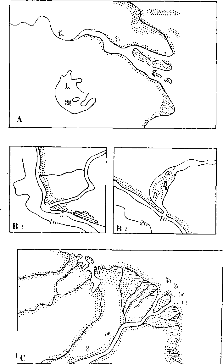 三角洲的类型复杂多样,可从不同角度进行分类。根据形态特征和形成过程可分为以下几种类型: ❶扇形三角洲:入海河流含沙量高,河道分汊多且经常改道,河口外海水较浅,使三角洲形成过程中能比较均匀地向海推进。如我国的黄河三角洲。黄河水的含沙量很大,中、下游的平均含沙量为25.3公斤/米3,中上游每年输沙量为16亿吨,经河口入海的泥沙约12亿吨,其含沙量是长江的47倍,是密西西比河的42倍,是亚马逊河的360倍。自1855年以来形成了面积5 932.6平方公里的现代黄河三角洲,每年以200—2 000米的速度向海推进。从1855年黄河改道由利津入海以来,三角洲已向海推进了约50公里(图2.C)。 ❷鸟爪形三角洲:在潮流、海流和波浪作用都很微弱的河口区,河流含沙量较高并分几股汊河入海,各汊河口泥沙迅速堆积,形成向海伸展较长的沙嘴,平面形态很像鸟爪,故称鸟爪形三角洲,以美国密西西比河三角洲最为典型(图1)。 ❸尖头形三角洲:河流入海(湖)时,只有一条干流,支流很少或很小,在干流河口处形成向海中突出的尖头形三角洲。如意大利的台伯河三角洲(图2.B1)和西班牙的埃布罗河三角洲。如果河流泥沙较少,岸边海水较深,波浪方向与海岸斜交,则形成河口内堆积的掩闭形三角洲,如非洲南端的奥伦治河三角洲(图2.B2)。 ❹岛屿形三角洲:在潮汐作用较强、河流含沙量不高的河口区,在潮水作用下,形成许多向海伸延的垄状沙滩和沙坝,沙坝之间被潮汐冲成水道,使沙洲、沙岛及汊河交错分布、河口外岛屿星罗棋布,故称岛屿形三角洲,如恒河三角洲。我国的长江三角洲从大轮廓上看应是尖头形三角洲(图2.A),但在河口区有许多沙岛、浅滩及汊河道,有人又把它归到岛屿形三角洲之内。三角洲地区地势平坦,土地肥沃,灌溉方便,是发展农业的好地方。在三角洲的沉积过程中,大量的有机质碎屑和淤泥,经过长期地质作用能形成丰富的石油和天然气。如美国的密西西比河三角洲、意大利的波河三角洲、原苏联的伏尔加河三角洲都含有丰富的油气资源。我国在黄河等几条大河河口的三角洲上也发现相当规模的油气田。 图2 三角洲的类型 A:尖头形三角洲(长江三角洲) B1:尖头形三角洲(意大利台伯河三角洲) B2:掩闭形三角洲(南非奥伦治河三角洲) C:扇形三角洲(黄河三角洲) ☚ 冲积平原 喀斯特作用 ☛ 三角洲见“海洋学”中的“三角洲”。 三角洲入海河口地区的冲积平原。河流在流入海洋或湖泊时,因流速降低,由所携泥沙堆积而成。一般呈三角形或弓形,顶端指向上游,底部为其外缘。地势低平,河流多汊道,河网密集,大部分为良好的农耕地区。如中国的珠江、长江和非洲的尼罗河等河口的三角洲。 三角洲江河口地区的冲积平原。江河在流入海洋或湖泊时,因流速减低,所带的泥沙沉积而成的陆地。一般呈三角形或扇形,顶端指向上游,底边为其外缘。三角洲地势低平,河网密集,多为良好的农耕地区。如中国的长江三角洲、珠江三角洲。 三角洲delta 三角洲delta 三角洲delta 三角洲delta |