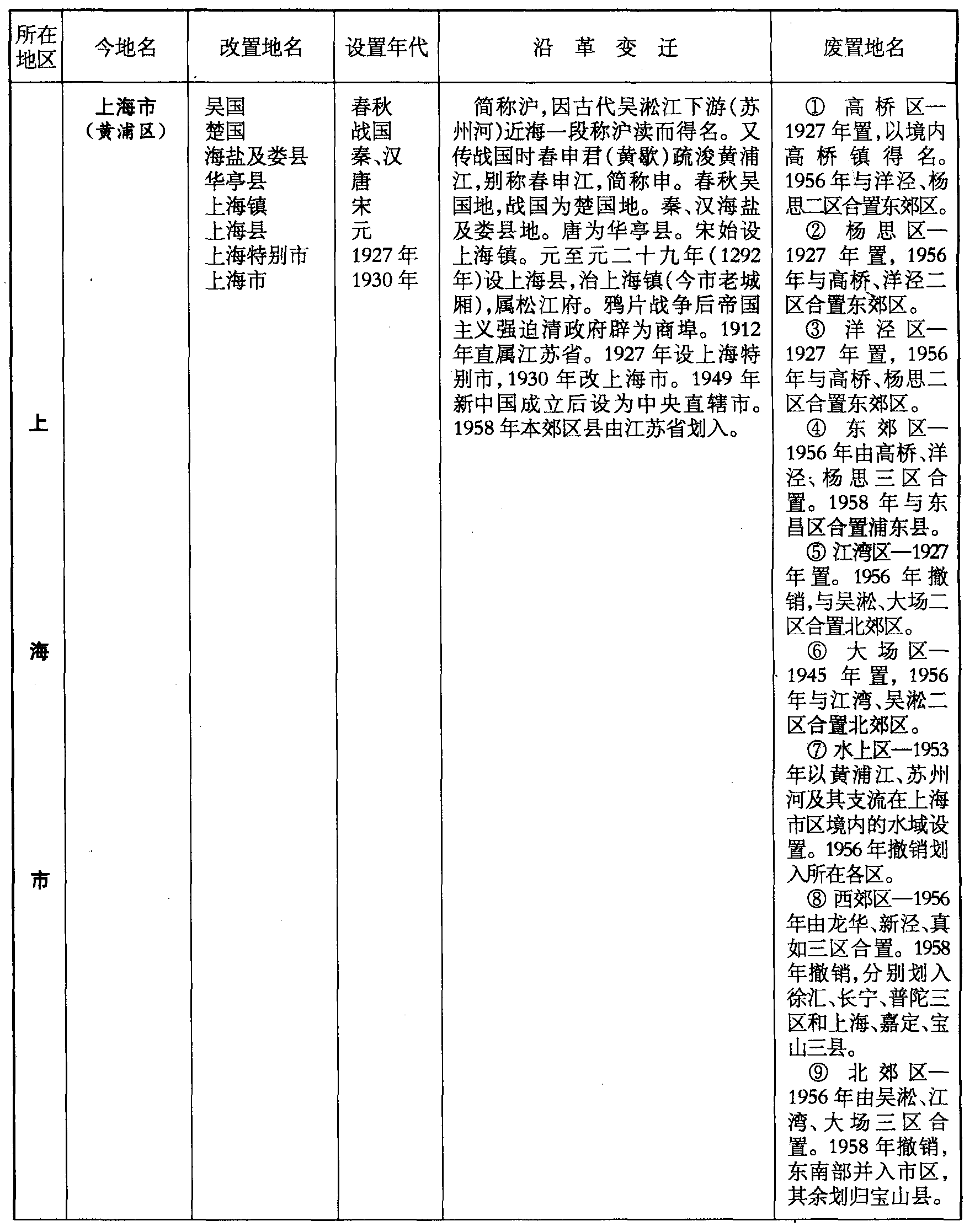 简称沪,因古代吴淞江下游(苏州河)近海一段称沪渎而得名。又传战国时春申君(黄歇)疏浚黄浦江,别称春申江,简称申。春秋吴国地,战国为楚国地。秦、汉海盐及娄县地。唐为华亭县。宋始设上海镇。元至元二十九年(1292年)设上海县,治上海镇(今市老城厢),属松江府。鸦片战争后帝国主义强迫清政府辟为商埠。1912年直属江苏省。1927年设上海特别市,1930年改上海市。1949年新中国成立后设为中央直辖市。1958年本郊区县由江苏省划入。