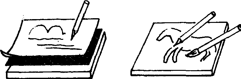 ❹贴稿法。这是中国复制木刻的上版方法,先用毛笔在薄宣纸、雁皮纸上勾出画稿轮廓,再在木版上涂一层稀薄浆糊,把画稿反贴在木版上。半干时用手轻轻将纸背搓擦去一层,墨稿清晰可见。