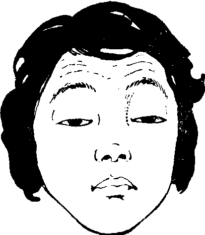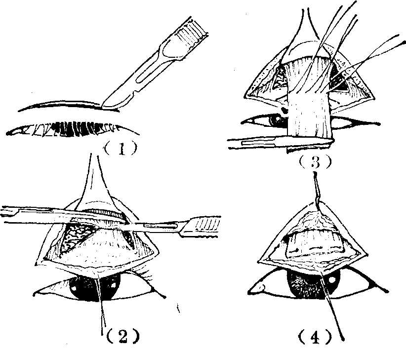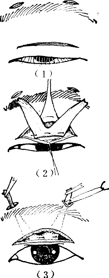 释义 | 上睑下垂ptosis of upper eyelid系指上睑位置低于正常并不同程度的妨碍外观或影响视力而言。可有先天性或后天性;可为单侧,亦可为双侧;可由提上睑肌与上直肌麻痹而引起,亦可由外伤及第3对脑神经麻痹而引起。临床表现有轻有重,有的影响视力。需针对病因治疗。 上睑下垂ptosis是由于提上睑肌功能不全或丧失,以致上睑不能提起或提起不全而遮盖部分或全部瞳孔。临床表现可有视力障碍,常皱起前额皮肤以开大睑裂,抬头仰视。可为单侧或双侧。先天性多见,系提睑肌发育功能不全所致。尚可伴其他先天异常,如小睑裂、小眼球等。因神经性病变、外伤性眼病所致的后遗症而表现上睑下垂为后天性。可手术或对症治疗。 上睑下垂 上睑下垂上睑下垂系指由于上睑提肌功能不全或消失,或其它原因所致的上睑部分或全部不能提起所造成的下垂状态。正常眼向正前方注视时,上睑缘只遮盖角膜的上五分之一到六分之一部分。下垂的上睑则可超过以上限度,甚而遮挡瞳孔领,阻碍视线。为了克服对视力的影响,病人常昂首下视或常收缩额肌,以提高上睑,使对侧健眼的上睑亦相应高举,因此显而易见的额部皱纹成为上睑下垂患者所特有的面容。临床上本病可分为完全性及部分性、单眼性或双眼性、先天性与后天性不同类型。治疗目的在于解除视力障碍及改善面容,除部分后天性上睑下垂外,一般都需通过手术矫治。 ☚ 睑闭合不全(兔眼) 上睑下垂矫正术 ☛ 上睑下垂 上睑下垂正常眼平视时上睑盖住角膜上缘约2mm,瞳孔区完全露出。如提上睑肌功能不全,上睑不能提举至正常高度,遮盖部分或全部瞳孔,称为上睑下垂。上睑由于机械重力作用(如睑炎症或肿瘤)、或因眼睑失去正常支撑作用(如小眼球或眼球萎缩),上睑也不能举起。但当局部病因去除后,即能恢复常态,这种情况称为假性上睑下垂。上睑下垂的病因有: ☚ 睑裂增宽 畏光与流泪 ☛ 上睑下垂 上睑下垂上睑睑缘位置,在正常张眼平视前方时,应位于角膜上缘与瞳孔上缘间的中点水平。如低于此水平,致上睑将瞳孔的一部分或甚至全部遮蔽,视线受到阻挡,称为上睑下垂。有先天性和后天性两类。 图1 先天性双侧上睑下垂 后天性上睑下垂,是由于外伤伤及上睑提肌或动眼神经所致。偶见由于上睑海绵状血管瘤或神经纤维瘤等瘤体下坠所致。常为单侧。外伤性下垂,需经1~11/2年以上时间的观察,确无恢复或继续恢复的迹象后,且局部皮肤软组织亦较松软时,才可考虑手术。 治疗前,须通过细心认真检查,以测定上睑提肌有无功能存在和功能低下的程度,作为选择手术方法的依据。检查时,检查者与受检者对坐,两人眼部须在同一水平,置量尺于受检者的眼侧,嘱张开两眼平视前方,记录上睑缘位置和瞳孔被遮盖的情况。然后用拇指紧压其两眉部,以排除额肌的代偿作用,并保持头部不得有俯仰活动,先向下看地,继向上看天,分别观测其上睑缘的位置,睑缘由向下至向上所移动的距离,即示上睑提肌的功能,正常值约为15mm。此外,尚可用肌电图测定。还应检查眼球向各方的活动,以了解各眼外肌和上直肌的功能,确定有无合并上直肌功能的减弱。 矫治上睑下垂的手术方式,大致可分为上睑提肌缩短,用额肌代行,或用上直肌代行上睑提肌功能等三类。手术选择主要视上睑提肌的功能情况确定。先天性下垂,当上睑提肌尚有一定程度的功能时,应首选上睑提肌缩短术,以增强肌力,提高其提睑能力。此种手术符合正常生理解剖要求,效果较好。如上睑提肌的功能已不复存在,或功能极差,即由向下转向上看时,睑缘移动距离小于3mm,则需行以额肌代行上睑提肌功能的手术。由于以上直肌代行上睑提肌功能的手术,术后易于发生下斜视、复视、兔眼和角膜暴露等并发症,故现已基本弃用。后天性下垂,由外伤所致肌肉、神经的严重损伤,如已无法修复以恢复其功能时,只有采用以额肌代行上睑提肌功能的手术。 上睑提肌缩短术,有经皮肤或经结膜两种不同经路的手术方法。皮肤经路,始于1883年(Everbush),后经不断改进,其基本原则,迄今仍被沿用。结膜经路,始于1859年(Bowman),其优点为无切口痕迹外露,但经结膜切口,可以切除上睑提肌的范围受限,故重度下垂需要切除的肌肉较多时,即难适用。两种经路,只是切口部位的不同,手术原则并无差别。均为游离上睑提肌后,依据下垂程度的轻重切除一段肌肉,将近侧肌断端与睑板重新缝合固定(图2)。先天性下垂,应作过度矫正。后天性下垂,如采用此法治疗,一般不宜过度矫正。 图2 皮肤经路上睑提肌缩短术 利用额肌悬吊加强或代行上睑提肌功能的手术,其基本原则是采用组织或组织代用品植入所剥离的皮下隧道内,连接于额肌和上睑之间,借助额肌的收缩提拉上睑,张大睑裂。组织移植,可用自体阔筋膜;组织代用品,如可用尼隆缝线、硅胶薄膜等。其中以自体筋膜为最常用,可行条状或片状移植,并有山字形、V字形、U字形、W字形等多种术式。筋膜的上端与额肌缝合固定,下端缝合在睑板上半的前侧(图3)。此外,有分离一束额肌形成肌瓣,向下牵拉直接与睑板缝合的方法。此类手术术后,每当张眼时,即伴随出现皱眉耸眉等不自然姿态,如下垂限于一侧,则左右对比益为明显。 图3 V字形阔筋膜条移植,利用额肌加强代行上睑提肌功能手术 上睑下垂手术一般常需作过度矫正,术后睑裂一时不能完全闭合,应