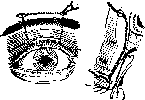 ❷借用额肌力量的手术: 是使眼睑肌肉与额肌相连接,借额肌的收缩带动眼睑而将其提起。但是这种举睑运动,仅是直线的上升,与生理状态下的弧形向上后方举睑运动不尽符合。只是因为这种手术操作简便,容易成功,遂为人所采用。完全的上睑下垂(包括麻痹性)或由于其他原因而不能施行增强提上睑肌力量手术的病例,可以采用。