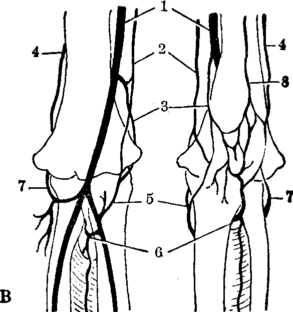 释义 | 上肢的动脉吻合 上肢的动脉吻合上肢的动脉吻合包括肩关节网、肘关节网、腕关节网及手的动脉弓等(见图)。 肩胛网与肘关节网 腕关节网 包括腕掌网和腕背网两部分。 ❶腕掌网比较细小,位于桡骨下端掌侧面,由桡、尺动脉的腕掌支、掌深弓的返支以及骨间前动脉的小支共同构成。 ❷腕背网发育良好,位于腕骨背面,由桡、尺动脉的腕背支和骨间前、后动脉的终末支吻合形成。腕背网向远侧发出三条掌背动脉分布于第2~5指近侧节相对缘的背侧。各掌背动脉在掌骨间隙近侧连接掌深弓的穿支,在远侧则与指掌侧总动脉的穿支交通。 手的动脉弓 包括掌浅弓及掌深弓(彩图18)。 ❶掌浅弓一般由尺动脉终末支与桡动脉掌浅支吻合构成。位于掌腱膜和掌短肌的深面,掌中间隙诸结构的浅面。弓的凸缘朝向手指,相当于拇指充分外展时沿其远侧缘所作的横线。掌浅弓除发出一些细小的肌支和皮支以外,还发出有:指掌侧总动脉三条,分别沿第2、3、4掌骨间隙走向远侧,在掌指关节处先与掌深弓的掌心动脉和腕背网的掌背动脉的穿支吻合,随即各分为两条指掌侧固有动脉,至相邻指的相对缘,其终末皆与邻近的同名动脉吻合而终。小指尺掌侧动脉,由弓单独发起,向远侧分布于小指尺侧缘。浅弓在多数情况下(约占81.25%)形成明显的弓状吻合,少数的(约占18.75%)并不形成弓状吻合。此外,掌浅弓往往发出较大的分支与拇主要动脉相连接,从而构成比掌浅弓强大的另一手掌动脉弓。根据国内资料,掌浅弓可分四个类型,即尺动脉型,约占46%;桡尺动脉型,占34%;缺如型,占19%;正中动脉型,占1%。 ❷掌深弓由桡动脉终末与尺动脉的掌深支吻合构成,其凸缘朝向手指,相当于通过钩骨远侧缘所画的横线,弓的位置较深,伴尺神经横跨于第2~4腕掌关节掌面,位于所有掌中间隙诸结构与骨间肌之间。掌深弓的分支有:三条掌心动脉,分别在第2~4掌骨间隙中走向远侧,至掌指关节处,发出细支与相应的指掌侧总动脉吻合,并分支布于骨间肌,蚓状肌及掌骨;返支,行向近侧,参加腕掌网;穿支,一般有三支,穿骨间肌入手背,同相应的掌背动脉吻合。 ☚ 尺动脉 主动脉胸部 ☛ |