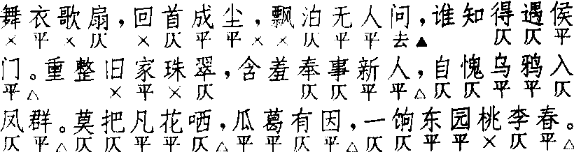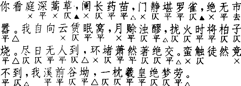 释义 | 下山虎 下山虎陆采 《明珠记》 ![]() 全曲十句:4,4△。5▲,4△。4,4△,7△。5△,4△,7△。 其二 徐复祚 《投梭记》 ![]() 全曲十二句:4▲,4△,5▲,4△。4,4△,7△。5△,7△。5△,4△,7△。第一式较第二式少第八、九两句,亦见于《狮吼记·顶灯》、《琴心记 ·私通侍者》、《锦笺记 ·协奏》、《节侠记·闻谪》。早期戏文《白兔记·牧牛》、《杀狗记·雪中救兄》皆为此式,明人不甚用之。第二式为通行格式,始于《琵琶记·拐儿绐误》、《荆钗记·就禄》,仅个别句式略有不同。〔下山虎〕皆以一支入套,连用二支者不多。以〔下山虎〕为主的集曲有〔山桃红〕、〔山虎看桃〕、〔山下夭桃〕、〔山虎嵌蛮牌〕、〔山云江风娇〕、〔下山遇多娇〕、〔忆虎序〕,见《南词简谱》。 ☚ 山桃红 蛮牌令 ☛ ![]() ![]() |
