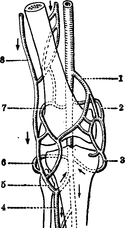 释义 | 下肢主要的动脉吻合 下肢主要的动脉吻合臀部的十字吻合网 在臀大肌深面,股方肌下缘,大转子附近,存在着十字形的动脉吻合。其横行的动脉是旋股内侧动脉的分支和旋股外侧动脉的横支,纵行的动脉为臀下动脉终末支和股深动脉第一穿动脉的升支。此十字吻合使下肢动脉与盆腔髂内动脉互相沟通。在股部股深动脉各穿支之间也存在吻合,第四穿动脉与腘动脉的 图1 髂内、髂外动脉的吻合 膝关节动脉网 位于膝关节周围和髌骨前面,由旋股外侧动脉的降支、膝降动脉、膝上内、膝上外动脉、膝下内、膝下外动脉、膝中动脉与胫前、胫后返动脉吻合而成。当膝关节运动时,虽然部分血管受到牵拉或压迫,由于膝关节网的存在,仍保证血液循环通畅无阻。由于腘动脉的诸关节支都呈水平位走行,来自股动脉的分支很少(仅有旋股外侧动脉降支和膝降动脉)。因此,小腿的动脉与股动脉之间的侧支吻合并不丰富,故临床施行腘动脉结扎时,应十分慎重(图2) 内踝、外踝动脉网 内踝、外踝动脉网分别位于内踝、外踝的表面,由胫前动脉、胫后动脉、腓动脉有关的分支及足背动脉跗内侧、跗外侧动脉组成。其延伸到跟结节周围的部分,称为跟骨血管网。 图2 膝关节周围动脉吻合(右侧前面观) ☚ 胫前动脉 静脉 ☛ |