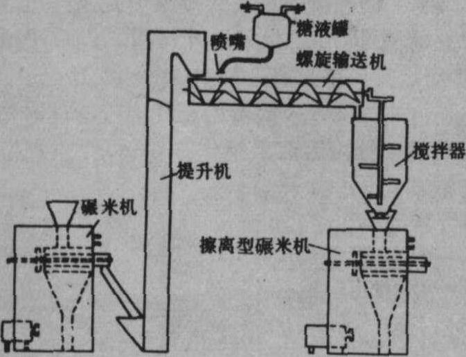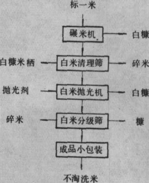 图1 不淘洗米成套设备示意图 以常规碾米法得到的白米为原料,先经第一道碾米机处理,然后加入糖液,经过搅拌器充分搅拌,将糖液均匀涂在白米表面,增加米粒光洁度,再经一道擦离型碾米机的研磨作用,加工成晶莹的不淘洗米(水晶米)。中国已投入批量生产的不淘洗米机是由精碾、白米除碎、抛光和成品精选等设备所组成。其工艺流程和设备如图2所示。 生产不淘洗米的原料为优质标一米,先经擦离型或混合型喷风碾米机进行精碾,碾得米粒内层米糠,因内层糠含淀粉和蛋白质较高,故称白糠,从米筛孔排出。经精碾后的精白米,利用平面回转运动的白米清理筛除去剩余白糠、米粞和碎米,送入专门设计的白米抛光机。其结构与碾米机相似,只是用铁辊或无毒尼龙抛光辊代替碾辊,抛光辊圆周速度为5米/秒左右。机内还装有抛光剂添加装置。精白米在抛光过程中,加入抛光剂,增加米粒光亮度,使米粒抛光,再经白米分级筛或精选机,除去超标的碎米和米粞,得到米粒光洁、晶莹粒齐、清洁卫生和易于贮藏的不淘洗米。最后,用塑料袋进行小包装。