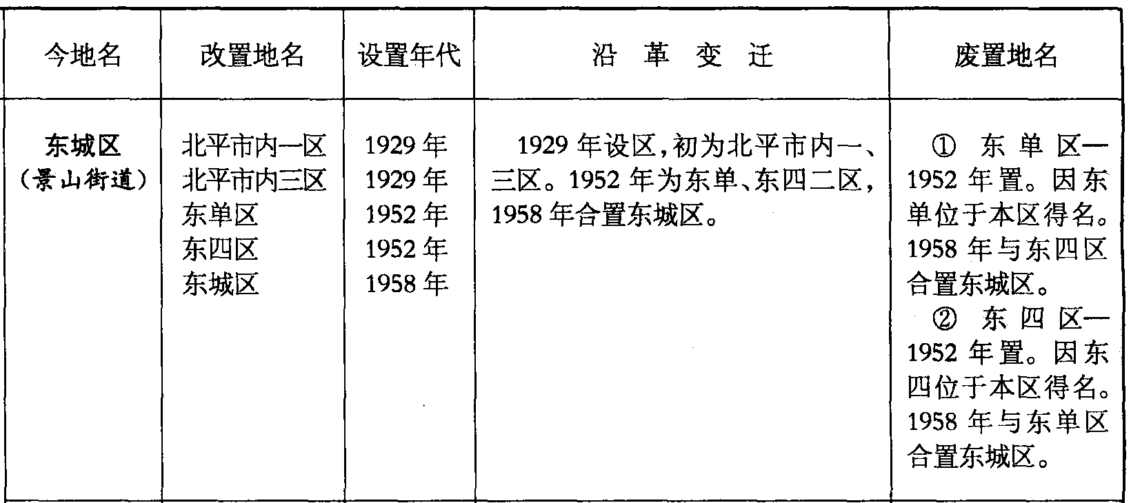 东城区(景山街道)北平市内一区北平市内三区东单区东四区东城区1929年1929年1952年1952年1958年1929年设区,初为北平市内一、三区。1952年为东单、东四二区,1958年合置东城区。❶ 东单区—1952年置。因东单位于本区得名。1958年与东四区合置东城区。❷ 东四区—1952年置。因东四位于本区得名。1958年与东单区合置东城区。