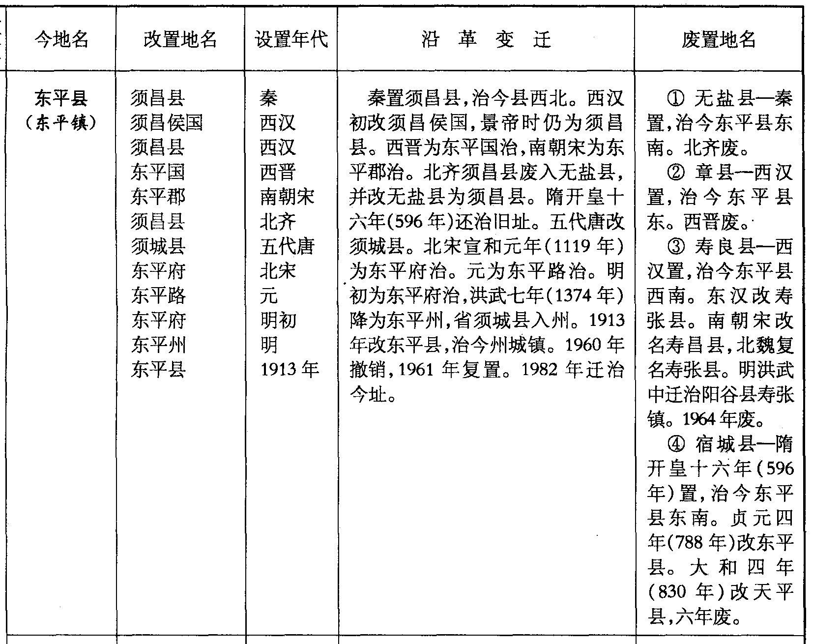 秦置须昌县,治今县西北。西汉初改须昌侯国,景帝时仍为须昌县。西晋为东平国治,南朝宋为东平郡治。北齐须昌县废入无盐县,并改无盐县为须昌县。隋开皇十六年(596年)还治旧址。五代唐改须城县。北宋宣和元年(1119年)为东平府治。元为东平路治。明初为东平府治,洪武七年(1374年)降为东平州,省须城县入州。1913年改东平县,治今州城镇。1960年撤销,1961年复置。1982年迁治今址。