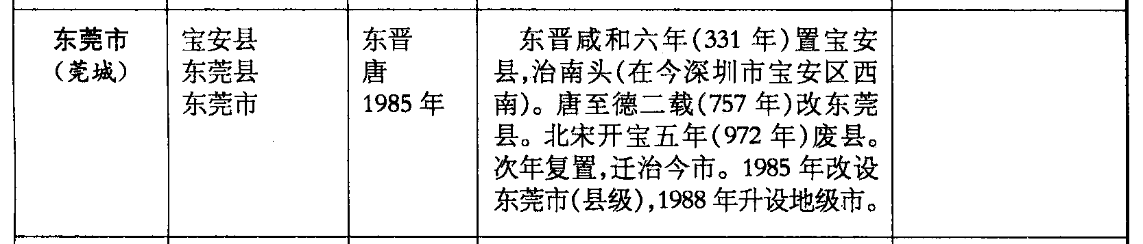 东莞市(莞城)宝安县东莞县东莞市东晋唐1985年东晋咸和六年(331年)置宝安县,治南头(在今深圳市宝安区西南)。唐至德二载(757年)改东莞县。北宋开宝五年(972年)废县。次年复置,迁治今市。1985年改设东莞市(县级),1988年升设地级市。
