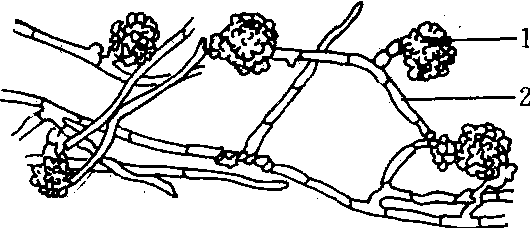 释义 | 丝椹霉属Papulospora半知菌亚门,无孢目。菌丝无色至淡色,单个分枝产生的小形或球形细胞纠积形成桑椹状、近球形、淡褐色、枯黄色至黑色菌核,不产生无性孢子。常见的有丝椹霉(Papulospora sp.),引致黄麻根腐病。 丝椹霉属 1.菌核 2.菌丝 |