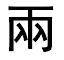 【提示】人,位于半包围结构里边时,捺改点。 *两(兩)liǎng7画 一部 (1) 数字,一加一的和,与“二”相当: ~天|~半儿|~支笔|~口人|~万三千五。 (2) 表示双方: ~便|~利|~相情愿|势不~立。 (3) 指称某些成对的亲属关系: ~兄弟|~姐妹|~兄妹|~口子(夫妻)。 (4) 表示不定的数目,限于二到九,相当于“几”: 回家取~本书|你真有~下子。 (5) 重量单位。市制10市两等于1市斤。旧制16两等于1斤。1两等于10钱。 两兩liǎng西周金文(两的本字)作,“两”字作,象车辕前部衡上的双轭(è)。车轭都是两个,所以义同“双”、“二”。如:两本书|两个人|两半|两千两万人(“二百”不说“两百”)。“两”的去掉一横的本字不用。小篆作兩,中一竖上通连上一横。隶楷同。宋代前后行书作“两”,较“兩”易写,现以为规范字。见《总表》。“两”的“二,双”引申义指双方。如:两便|两全。又表示不定的数目。如:过两天再说|真有两下子。又假借作重量单位。旧以十六两为一斤,现在十两为一斤。如:半斤八两。 古汉语仍用作车辆的辆,保持形义来源,读去声liàng。 两兩★繁◎常★常◎异
