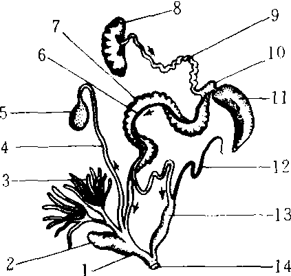 1.阴道 2.矢囊 3.黏液腺 4. 交配囊管 5. 受精囊 6. 输卵管 7.输精管 8.两性腺 9. 两性管 10. 储精囊 11. 蛋白腺 12.鞭状体 13.阴茎囊 14.生殖孔