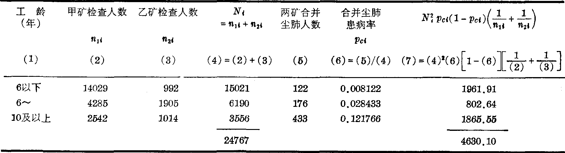 用甲乙两矿合并的检查人数作标准人口,计算两标化率之差的标准误Sp′1-p′2,如表。