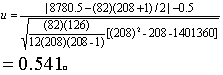 H0:两种病情病人的疗效总体分布相同,H1:两种病情病人的疗效不同。 a=0.05。 编秩。此例疗效依次分为四个等级,各等级的病人总数见表3第(3)栏。疗效为“控制”者共有65 + 42 =107人,应占秩次1~107,这107人属同一等级,不能分列高低,故一律以其平均秩次(1+107)/2=54代表;余类推,全部秩次范围及平均秩次分列于第(4)、(5)栏。 求秩和。分别将第(5)栏乘第(1)、(2)栏人数,相加即得两组各自的秩和,见第(6)、(7)栏。如用式(1)检查:8780.5+12955.5=21736,(208)(208+1)/2=21736,说明计算无误。 此例n1=82,n2=126,n2-n1=44,已超出表1所列范围,可由式(2)求u值。又由于此资料的相同秩次很多,须按式(3)作校正。计算过程如表4。 表4 表3资料相同秩次的校正计算