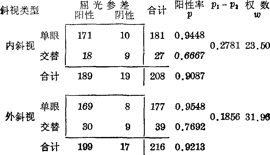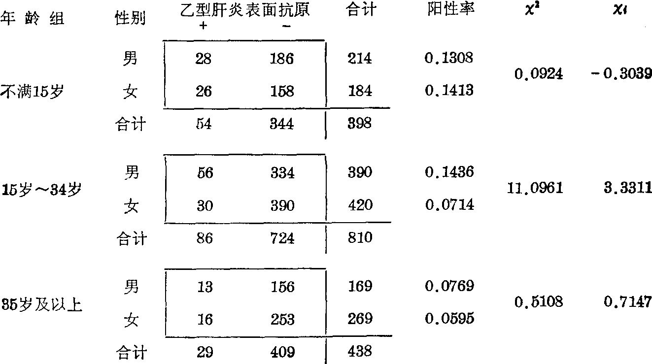H0: π1=π2,即两组的成功率相等; H1: π1≠ π2,即两组的成功率不等。 α=0.05。 本例各次试验都是5分钟成功率比3分钟高,趋势相同。每次资料均可列成四格表形式,如第一次试验: 仿此求得六个x2值,列于表3左侧,合并x2=14.80。四格表的自由度为1,六个四格表自由度相加为6。查x2界值表得0.025>P>0.01,按α=0.05水准拒绝H0,接受H1,故可认为用甲型25号止血粉压迫3分钟和5分钟的止血成功率不等,压迫5分钟的止血成功率高于压迫3分钟。 合并 ![]() ![]() 例7 某地调查人群中乙型肝炎表面抗原携带情况,得资料如下,问男女间乙型肝炎表面抗原阳性率有无差别? H0: π1 =π2,即男女阳性率相等;H1: π1≠π2,即男女阳性率不等。 α=0.05。 今k=3,按式(9): 查u界值表,得0.05>P>0.02,按α=0.05水准拒绝H0,接受H1,说明该地男女居民乙型肝炎表面抗原的阳性率不同,男性的阳性率较高。 加权合并法 (W.G.Cochran,1954) 若各个四格表的总例数n相差较大,或有四格表中两样本含量相差超过1倍时,显然不应把各表中两样本率之差同等看待,而应按式(10)作加权u检验。 例8 观察了424例斜视患者双目屈光参差的情况,资料如下,问单眼斜视与交替斜视的屈光参差阳性率有无差别? H0: π1=π2,即单眼与交替斜视屈光参差阳性率相等; H1:π1 ≠π2,即单眼与交替斜视屈光参差阳性率不等。 α=0.05。 计算每一个四格表的阳性率p及权数w,列于上表右侧。如内斜视四格表: 外斜视四格表仿此计算。将结果代入式(10)得 查u界值表,得P<0.01,按α=0.05水准拒绝H0,接受H1。说明单眼斜视与交替斜视的屈光参差阳性率有差别,单眼斜视患者的阳性率较高。 x2齐性检验 样本资料的合并是在资料同质的前提下进行的,因而需要考查各样本是否来自同一总体。若经假设检验认为各样本不是来自同一总体,则称存在间杂性;反之称齐性。比如,四格表资料的合并必要时应通过x2齐性检验。检验假设H0为各四格表资料属齐性。方法步骤: ❶先分别计算各四格表的x2值及自由度并分别相加得合计值; ❷求合并四格表的x2值及自由度; ❸求“合计”与“合并”相差的x2值及自由度,以此查x2界值表得P值,按所取检验水准作出推断结论。 例9 对例7资料作齐性检验。H0:三个年龄组资料属齐性,H1:三个年龄组资料非齐性。 α=0.05。 三个年龄组各四格表的x2值见例7,自由度各为1,“合计值”,x2为0.0924+11.0961 +0.5108=11.6993,v=1+1+1=3。再将三个四格表合并,求“合并值”:
