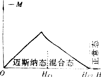 超导体按其磁化特性可分成两类,即第Ⅰ类和第Ⅱ类。这两类超导体的超导电性机制没有差别,但迈斯纳效应完全不同。第Ⅰ类超导体完全排除磁场,直到超导电性被突然破坏,然后被磁场完全穿透,只有一个临界磁场Hc,其磁化曲线如图1所示。当外加磁场H小于Hc时,超导体处在超导态,表现出完全的迈斯纳效应,称超导体处于迈斯纳态;当外加磁场H≥Hc时,超导体处于正常状态。绝大多数元素超导体为第Ⅰ类超导体。但它们的临界磁场太低,作为超导磁体的线圈没有什么应用价值。第Ⅱ类超导体有两个临界磁场,即下临界磁场Hc1和上临界磁场Hc2,其磁化曲线如图2所示。只要外磁场H>Hc2,第Ⅱ类超导体不具有超导电性。当外磁场Hc1和Hc2之间,第Ⅱ类超导体处于混合态,体内有磁力线穿过,这些磁场不为零的区域形成许多半径很小的圆柱形正常区,其周围是连通的超导区,超导区的表面仍存在抗磁超导电流,如图3所示。显然,在正常区内磁场和电阻率都不为零,在超导区内都为零。这样,第Ⅱ类超导体处于混合态时,既具有不完全的抗磁性(体内存在H≠0的正常区域),又保持零电阻性(存在连通的超导区域)。所以,这时的迈斯纳效应是不完全的。当外磁场增加时,圆柱形的正常区域大小不变,但数目增多。当外磁场增大到Hc2时,相邻的正常区域彼此接触,超导区域随之消失,于是整个超导体转变到正常态,被磁场完全穿透。在现有的超导体中,铌(Nb)、钒(V)、锝(Tc)以及大多数合金和化合物超导体都属于第Ⅱ类。