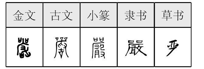 yán嚴,形声,从吅(xuān), (yín)声,本义为督教的命令紧急,引申为严密、紧密、认真、不放松、厉害、庄重、父亲等。《简化字表》参考明代俗字简作“严”。 【辨析】 ❶以“严”作音符构成的形声字一般读yɑn,但声调不同。yǎn:俨∣yàn:酽。 ❷“严(嚴)”可作类推简化偏旁使用,如:俨(儼)、酽(釅)。 |