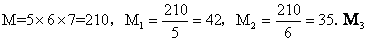 令m1=5, m2=6, m3=7, 则m1, m2, m3两两互素,