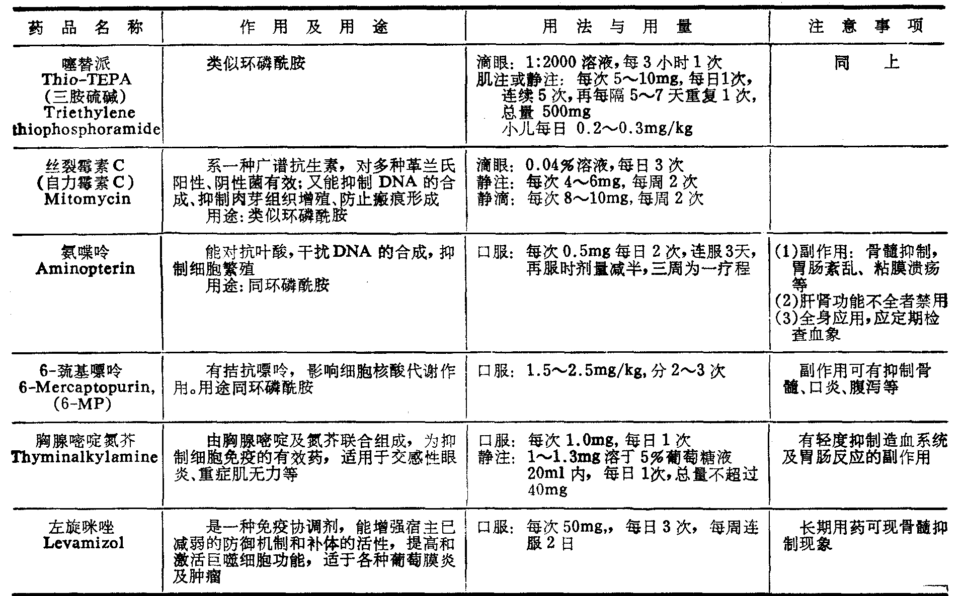 续上表  注: 在这一类药物中,氨甲喋呤和氨喋呤的作用和用途类同: 硫唑嘌呤与6-巯基嘌呤相似。其它一些抗肿瘤药物如争光霉素、苯丁酸氮介、 癌宁等偶而也被选用。此外,强的松类药物也具有免疫抑制的作用。左旋咪唑系一免疫协调剂,有增强免疫功能的作用。 维生素类Vitamins