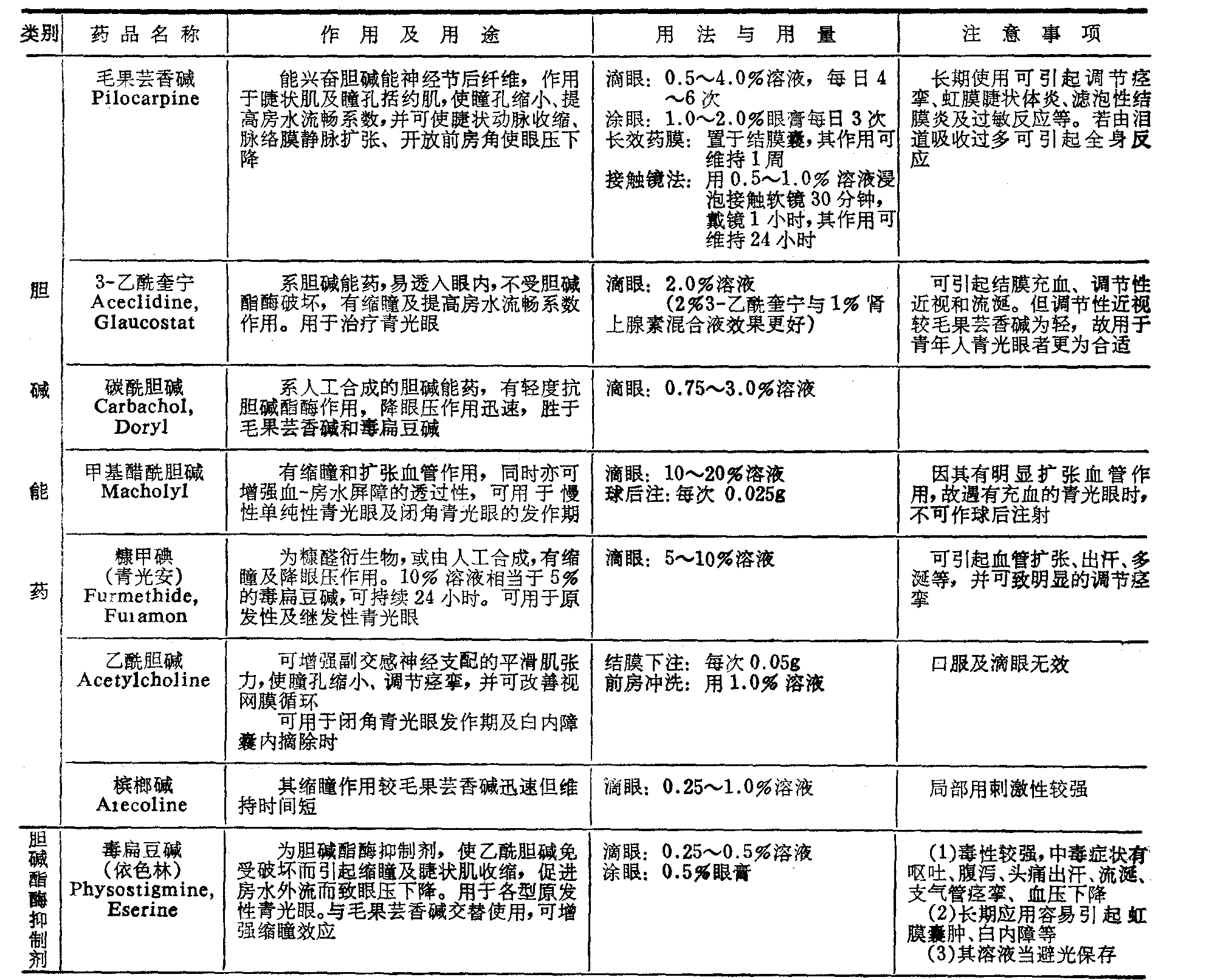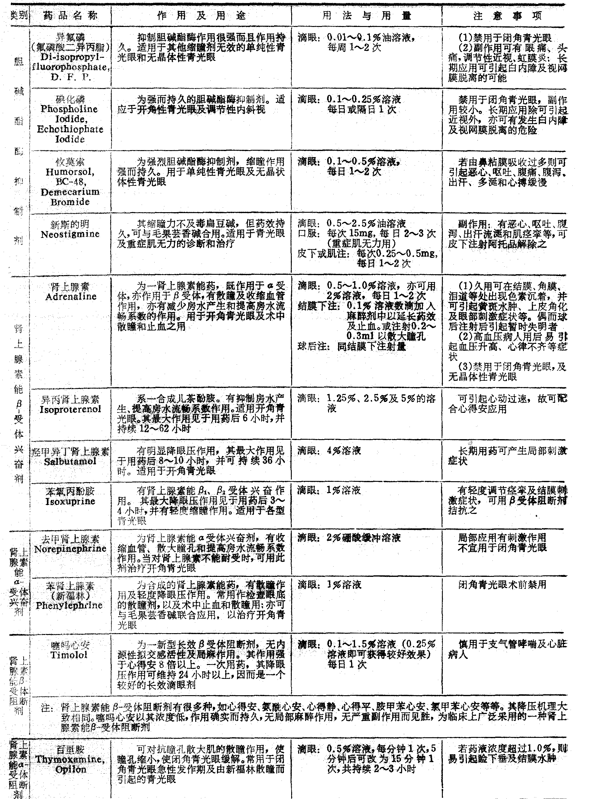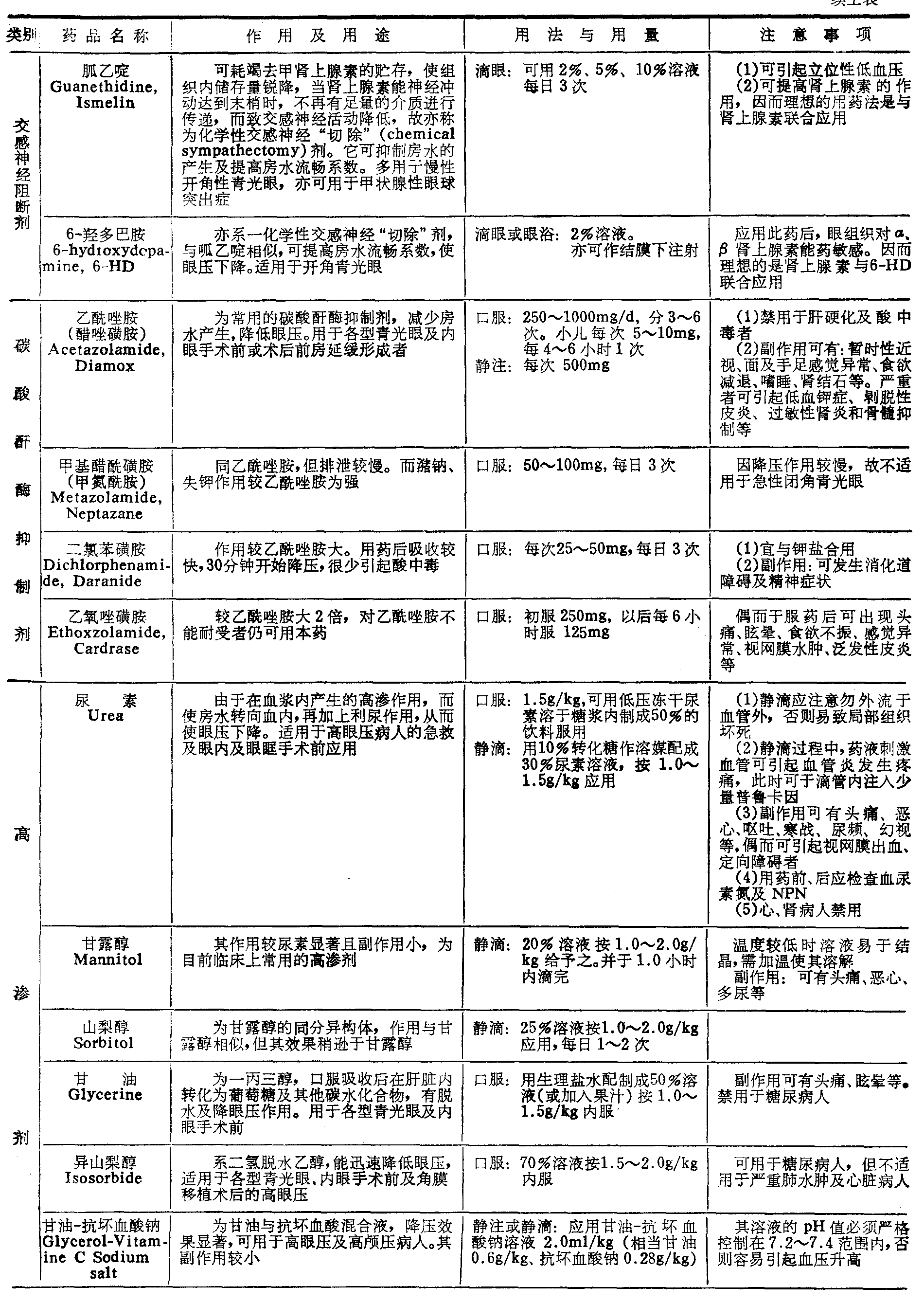 续上表  注: 麻黄碱、肾上腺素、去甲肾上腺素、苯肾上腺素、可卡因等也有扩瞳作用,多用于检查眼底,和其他散瞳-睫状肌麻痹剂合用时,可获得较为迅速和强烈的扩瞳作用。 降眼压剂Hypotensive agents 包括:胆碱能药(cholinergic drugs)、胆碱酯酶抑制剂(cholinesterase inhibitors)、肾上腺素能β-受体兴奋剂(β-Adrenergicagents)、 肾上腺素能α-受体兴奋剂(α-Adrenergic agents)、肾上腺素能β-受体阻断剂(β-Adrenergic blocking agents)、肾上腺素能α-受体阻断剂(α-Adrenergic blocking agents)、 交感神经阻断剂(Sympathetic blockers)、碳酸酐酶抑制剂(CarbonicAnhydrase inhibitors)、高渗剂(Hyperosmotic agents)等。