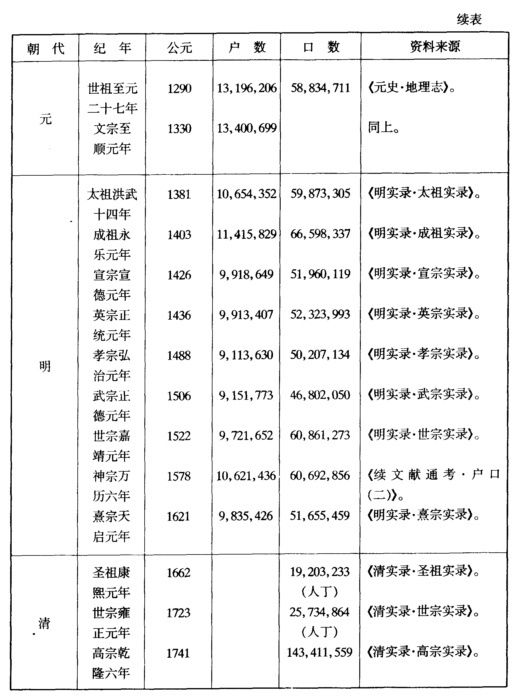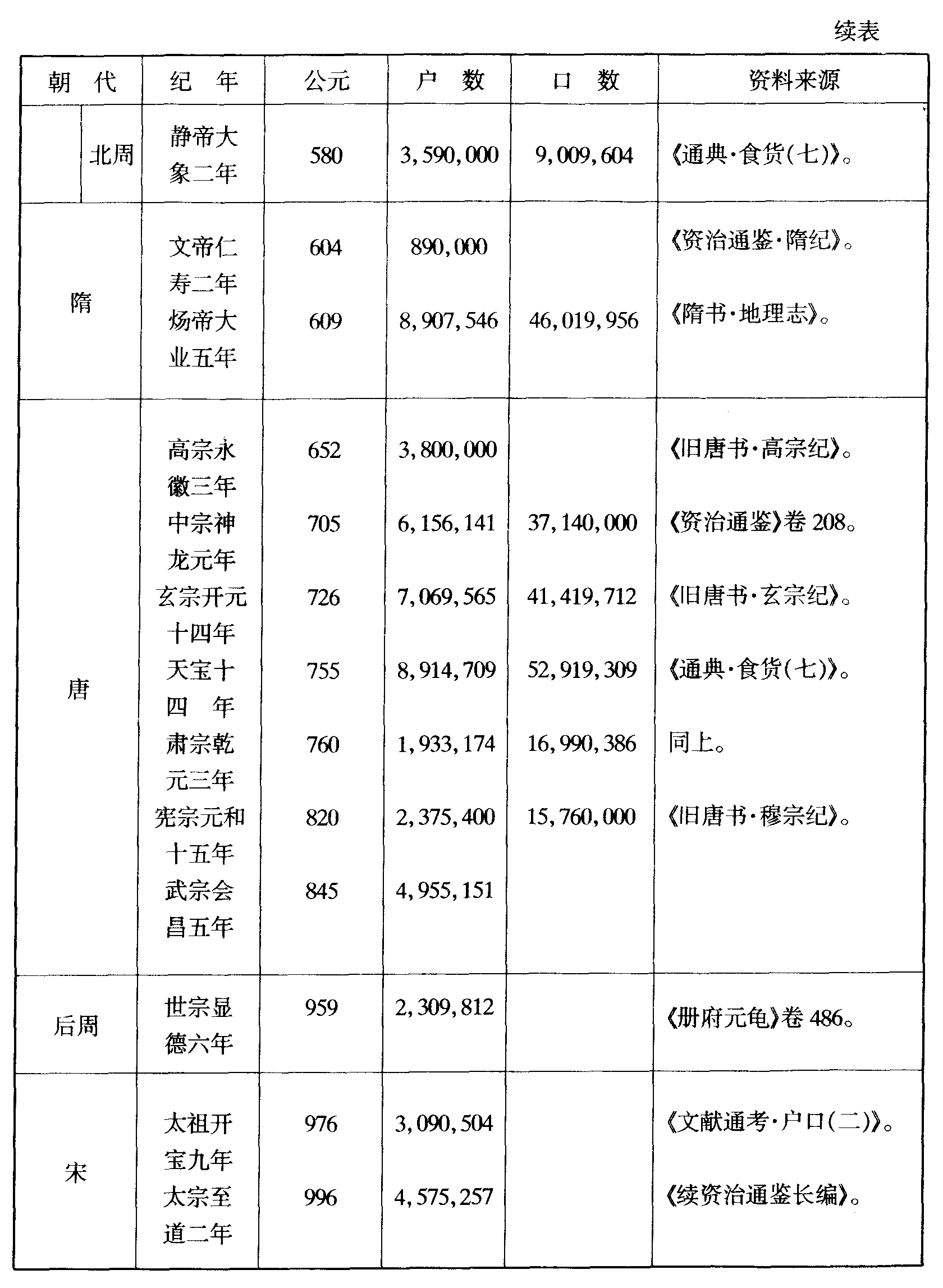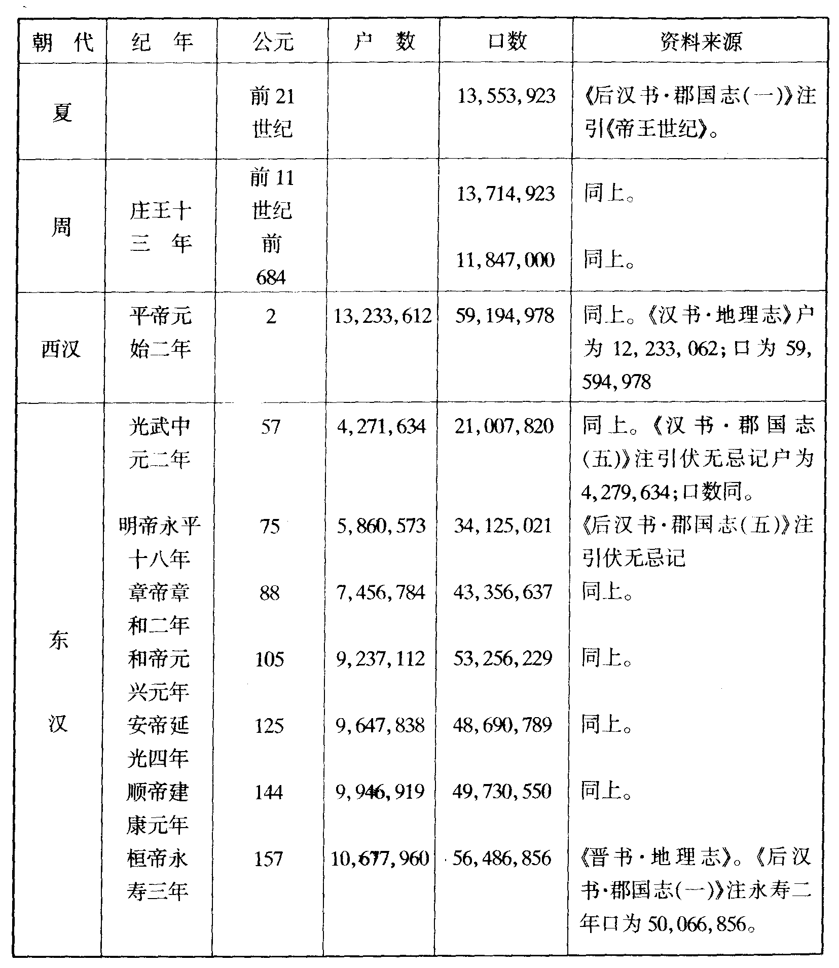 说明:(1)本表是根据历史记载中的部分资料编制的。制表过程中参考了梁方仲《中国历代户口、田地、田赋统计》,赵文林、谢淑君《中国人口史》等书。 (2)中国历代对于户口记录之多,是世界所仅见的。但口径不一,详略不同。本表资料的取舍,力求反映中国人口的发展趋势及其波动情况。对于查不到记录的朝代,只好阙加;对于记录较少的朝代,即使觉得数字有疑,亦作照录;对于记录较丰的朝代,则参照帝王更替、社会治乱及人口变动起伏情况,酌录具有代表性的数字。 |