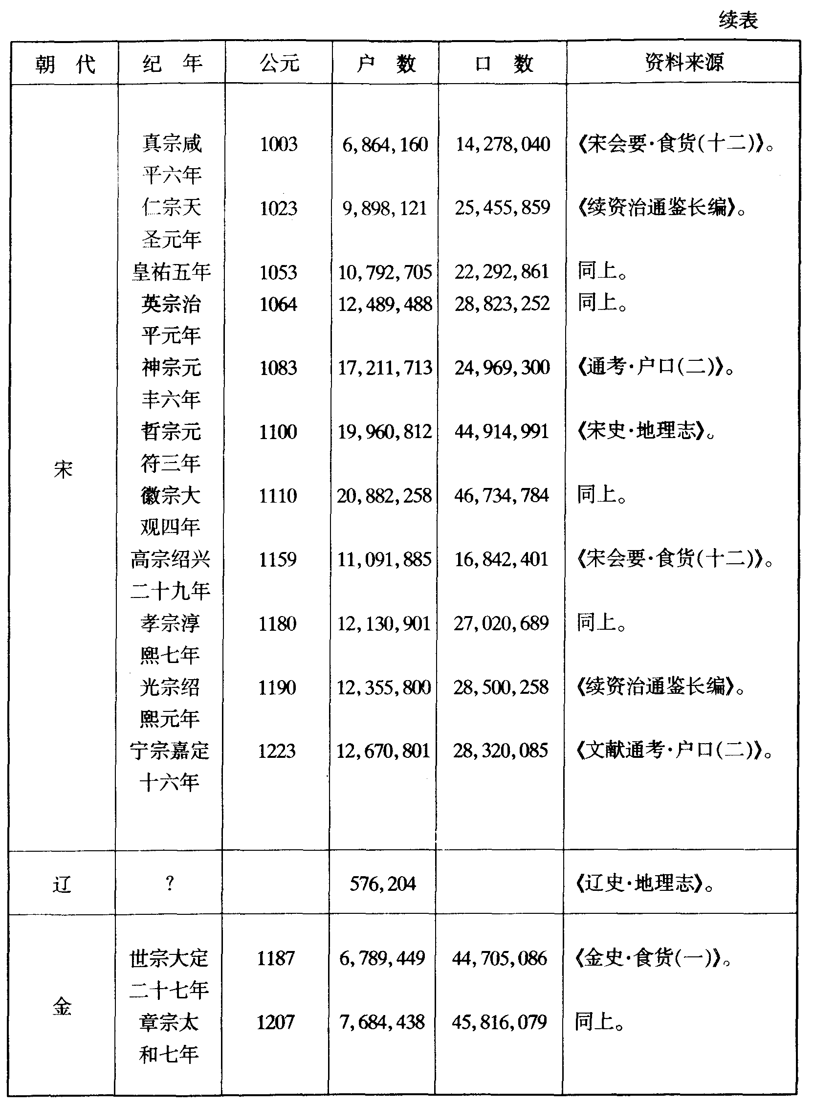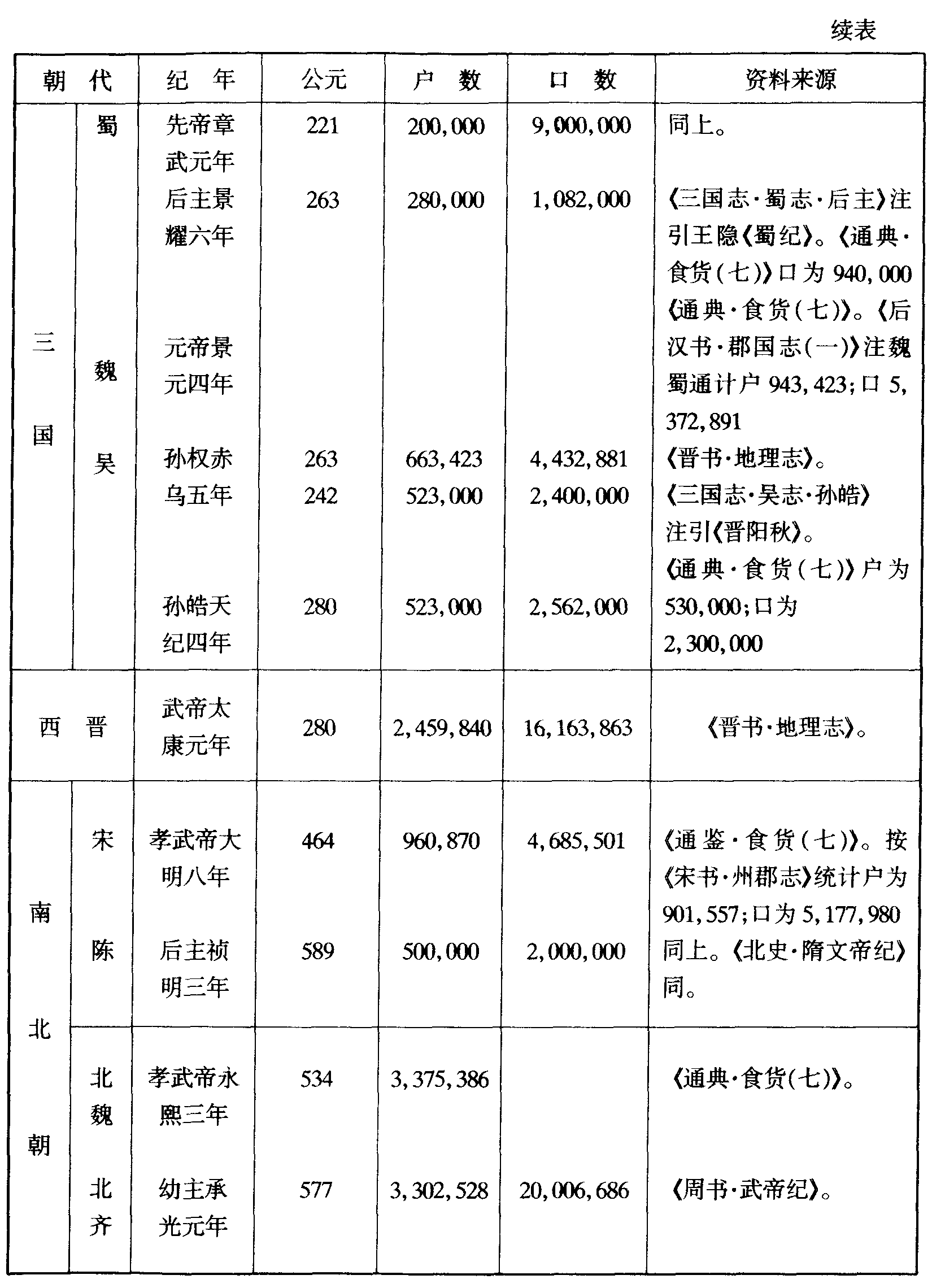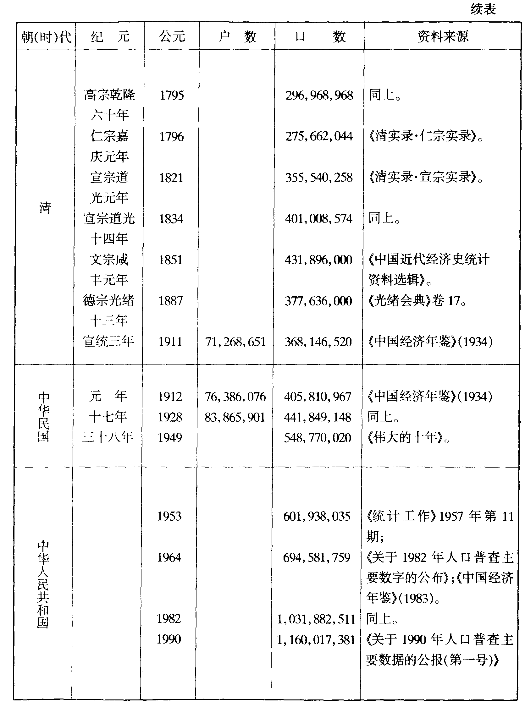 说明:(1)本表是根据历史记载中的部分资料编制的。制表过程中参考了梁方仲《中国历代户口、田地、田赋统计》,赵文林、谢淑君《中国人口史》等书。 (2)中国历代对于户口记录之多,是世界所仅见的。但口径不一,详略不同。本表资料的取舍,力求反映中国人口的发展趋势及其波动情况。对于查不到记录的朝代,只好阙加;对于记录较少的朝代,即使觉得数字有疑,亦作照录;对于记录较丰的朝代,则参照帝王更替、社会治乱及人口变动起伏情况,酌录具有代表性的数字。 |
