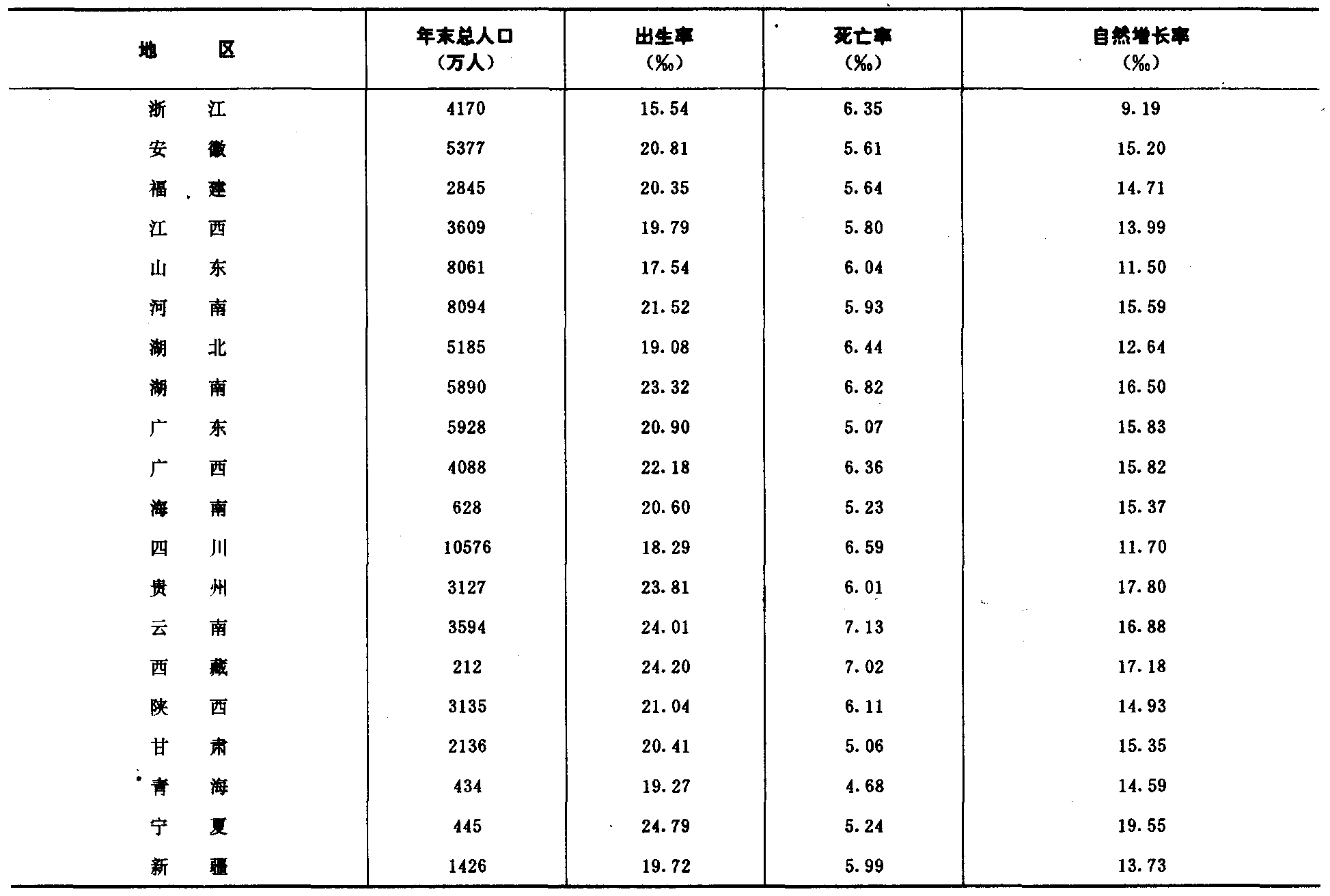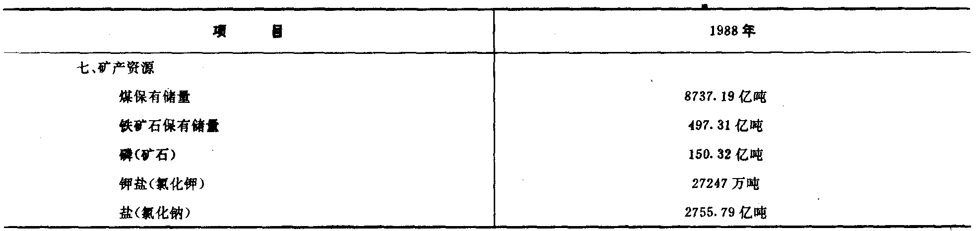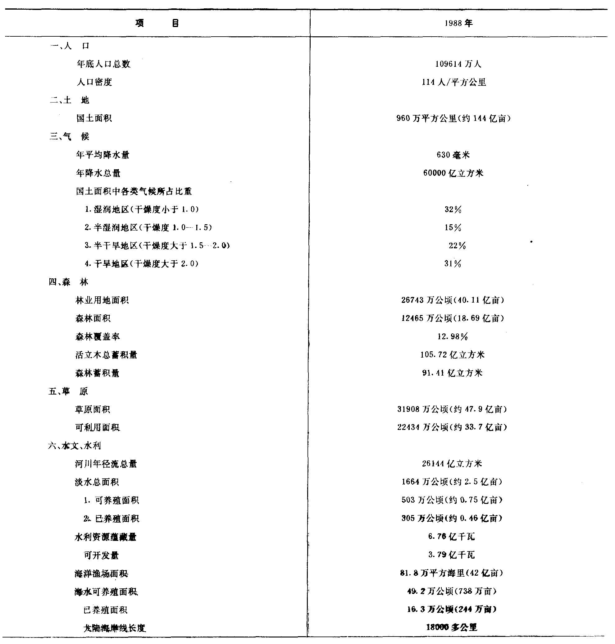 注:1.本表数字除第二、四项外,均未包括台湾省;2.人口总数中包括现役军人;3.本表草原、水面、水力资源等数字,大多是前几年的清查数,有待进一步普查和勘测;4.森林资源为第三次(1984—1988)森林清查资料。 |