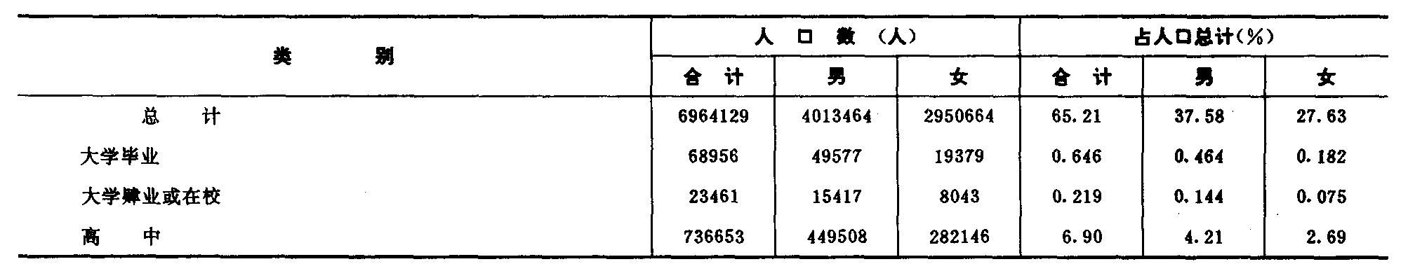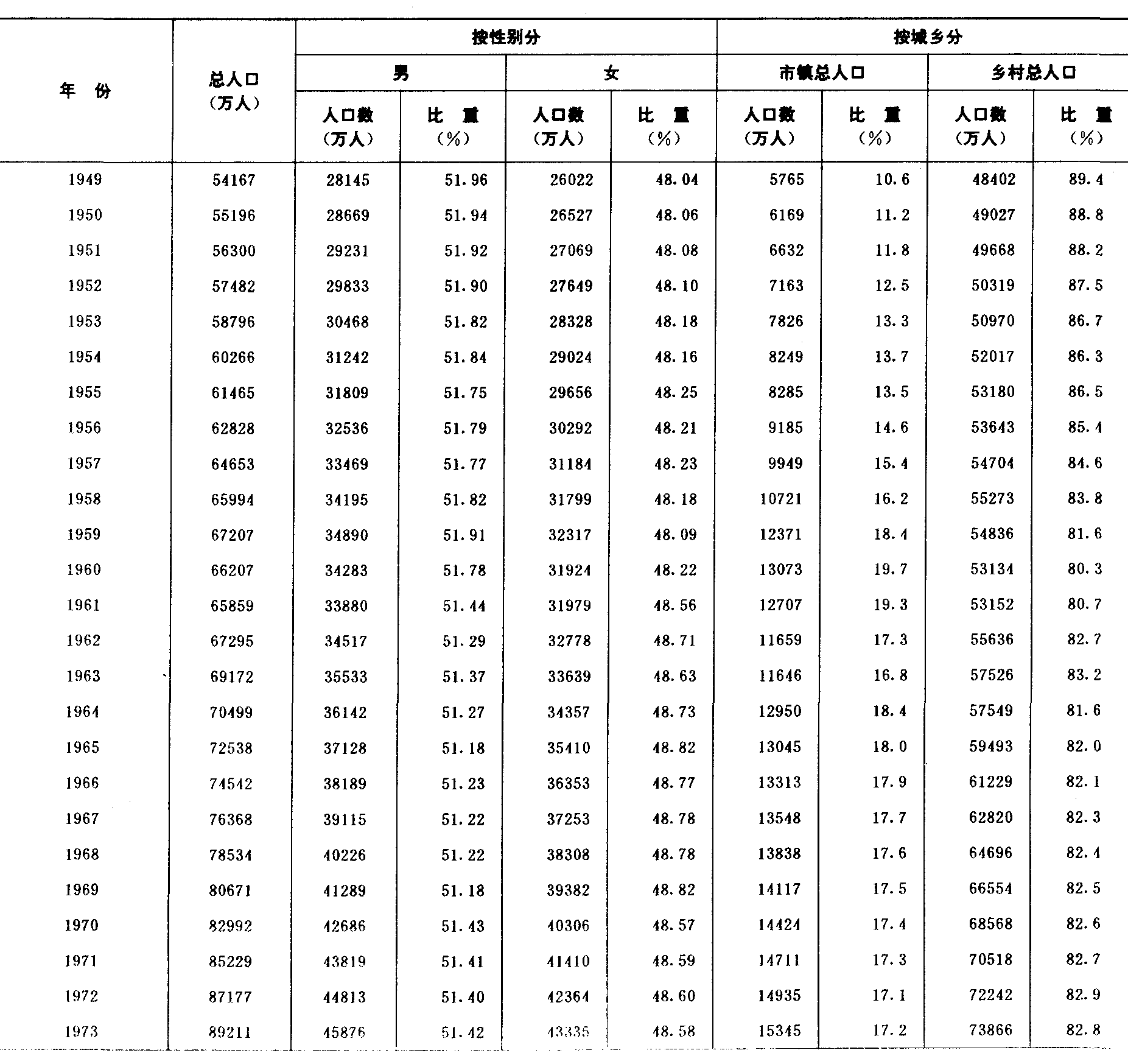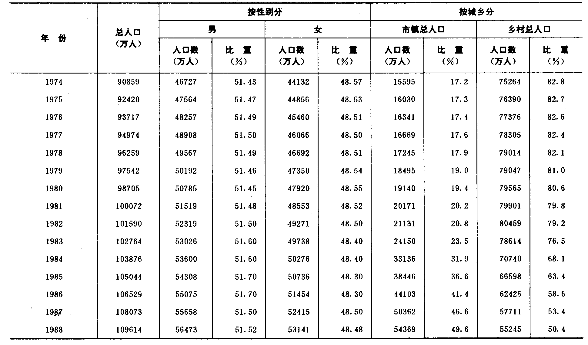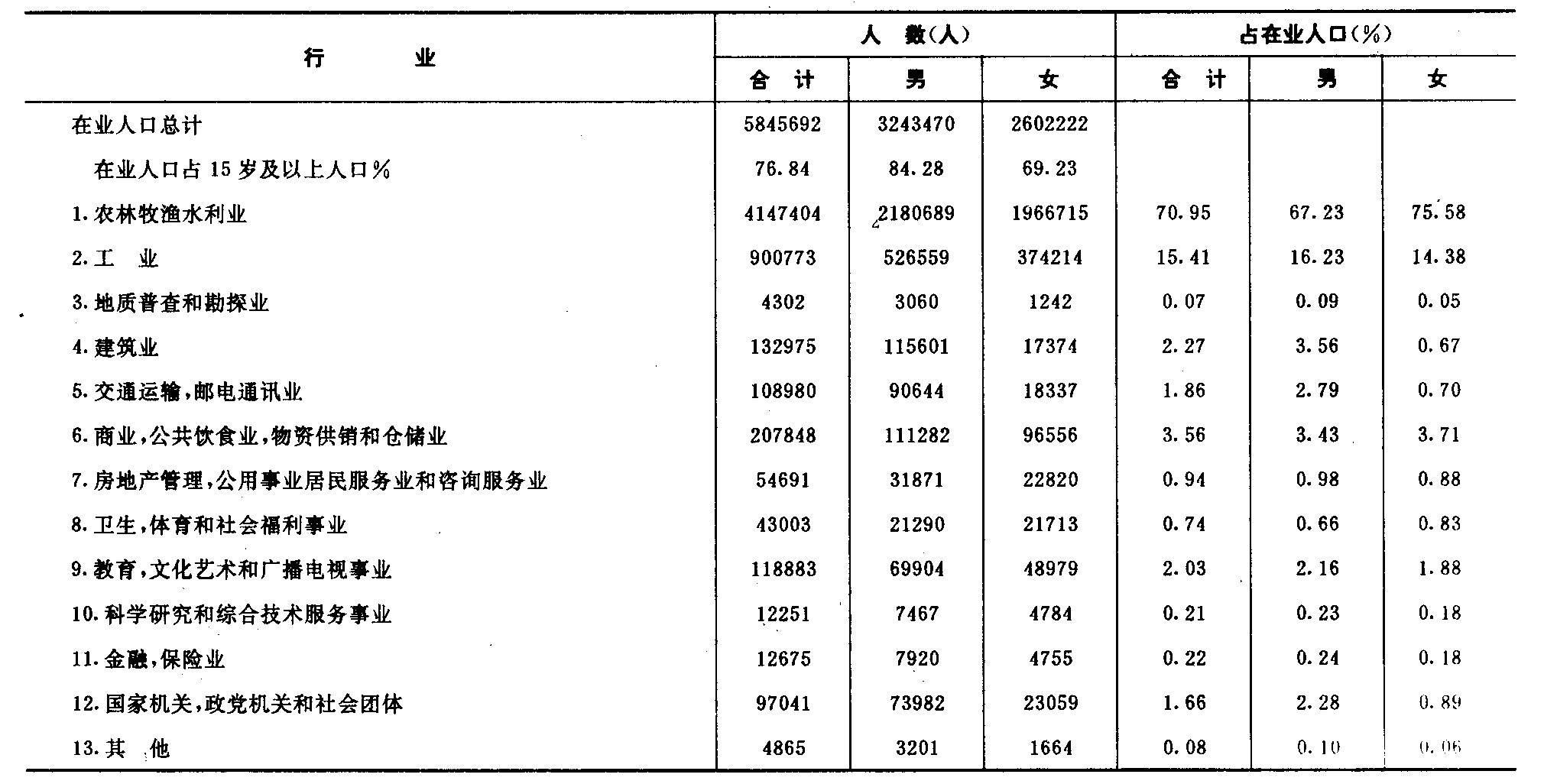 注:1.本表各年人口包括大陆29个省、自治区、直辖市和现役军人数字。2.市镇总人口是指辖区内全部人口:乡村总人口是指县人口,但不包括镇人口。1984年建镇标准有调整,新建镇较多,因此1984年以来市镇总人口增加较多。3.1982年以后数字,是根据1982年人口普查数字和历年的人口变动抽样调整数据推算的。11—4 分 行 业 人 口 (1987年1%人口抽样调查资料)