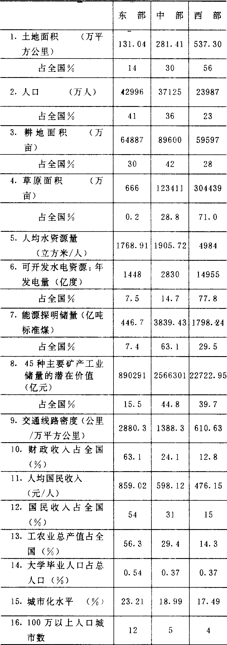 释义 | 中国的三大经济地带 中国的三大经济地带zhongguo de sanda jingji didai我国第七个五年计划将全国划分为东部、中部和西部三个经济地带。三大经济地带划分的原则是:地理位置特点;经济技术水平、发展条件和发展方向的相对一致性;保持省级行政区的完整性。东部地带包括北京、天津、上海、辽宁、河北、山东、江苏、浙江、福建、广东、广西、海南等12个省、市、自治区;中部地带包括黑龙江、吉林、内蒙古、山西、河南、安徽、江西、湖北、湖南等9个省、自治区;西部地带包括宁夏、陕西、甘肃、青海、新疆、四川、贵州、云南、西藏等9个省、自治区(注:台湾省暂不包括在三个地带中)。 三大经济地带主要社会经济指标对比 (1985年) 中部地带处于 “承东启西”的战略位置,资源十分丰富,矿产探明储量占全国重要地位的有煤、石油、铜、铝、铅、锌、钨、锑等多种矿产,水能和森林也很丰富;经过40年建设,很多工业部门,特别是原材料生产在全国占突出地位。本带应抓紧能源和原材料开发建设,发挥全国性的能源、原材料基地的作用;同时,应加快产业结构的调整,发展加工工业,提高产业关联度和加工能力,以增强经济效益、提高经济活力,努力改变产品初级化、产业结构低效的局面。 西部地带地域广阔,能源、矿产等后备资源丰富,发展潜力大; 其限制性因素是经济技术水平较低,生产力水平落后,交通不便,科技文化水平较低。当前,应充分利用东部地区面临能源、原材料短缺的矛盾和东部、中部产业结构调整的时机,立足丰富的资源,迅速开发资源组合好的地区,并发展有原料优势的加工工业,如耗能高的部门和有地区特色的轻纺工业。 ☚ 中国的经济区划 中国的经济开发区 ☛ |