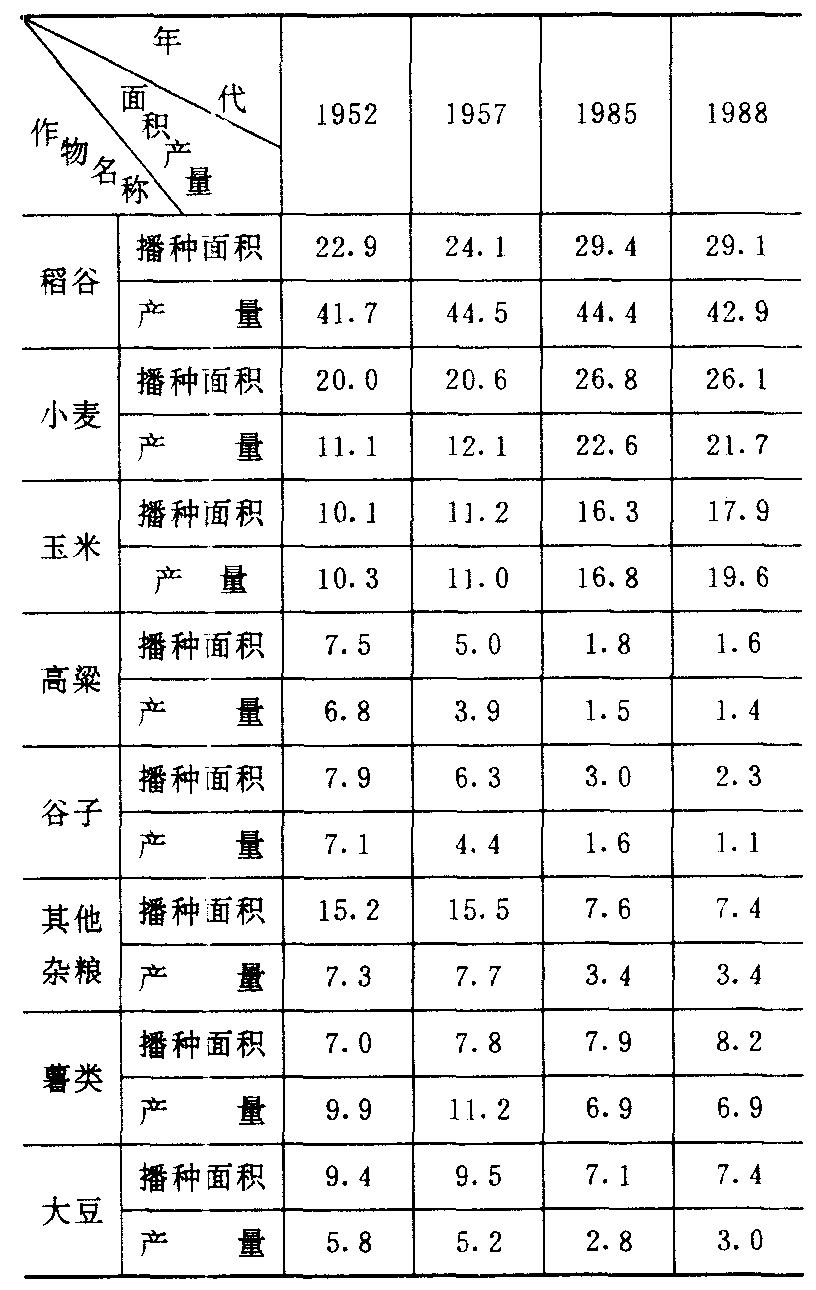 中国粮食作物的种类很多,主要包括稻谷、小麦、薯类、玉米、高粱、谷子、大豆和其他杂粮8类。每种作物又各有许多品种。粮食作物的结构及其在粮食生产总量中所处地位,在不同的历史时期不同的。例如在西汉以前,耐瘠而抗旱性能强的谷子,在粮食生产总量中占据首位。以后随着生产条件的改变和经济重心的南移,水稻逐渐超过了谷子,并且一直遥遥领先。1949年以来,稻谷发展很快,而谷子在粮食作物总产量中的地位已退居末位。我国现在粮食作物的结构(见下表)是以水稻、小麦为主。其主要特点是: ❶稻谷和小麦等细粮的比重逐渐提高。并占绝对优势。据统计,1988年稻谷播种面积占粮食作物总播种面积的29%,小麦占26.2%。稻谷产量占粮食作物总产量的42.9%,小麦占21.9%。 ❷玉米和薯类等适应性强的高产作物比重增加迅速。中华人民共和国成立初,玉米在粮食总播种面积和总产量中的比重只有10%左右,而1985年分别为16.3%和16.8%。薯类在70年代以前增长较快,后略有下降趋势。 ❸高粱、谷子、大豆和其它小杂粮的比重下降。如1984年和1952年之比,高粱和谷子的产量占粮食作物总产量的比重,分别下降了5%左右,大豆下降了3%左右。从粮食产量的季节性来看,我国以秋粮为主。1984年秋粮占粮食总播种面积的77.4%和总产量的72.5%。但夏粮的比重也略有上升。从粮食作物的地域结构看,秦岭、淮河以北,耕地以旱地为主,主要粮食作物是小麦,长城以北是春小麦,长城以南是冬小麦。秦岭、淮河以南,耕地以水田为主,水稻在农作物中占最大比重,但也有冬小麦、冬油菜、冬甘薯等与稻谷进行复种轮作。 各种粮食作物所占比重变化表 %