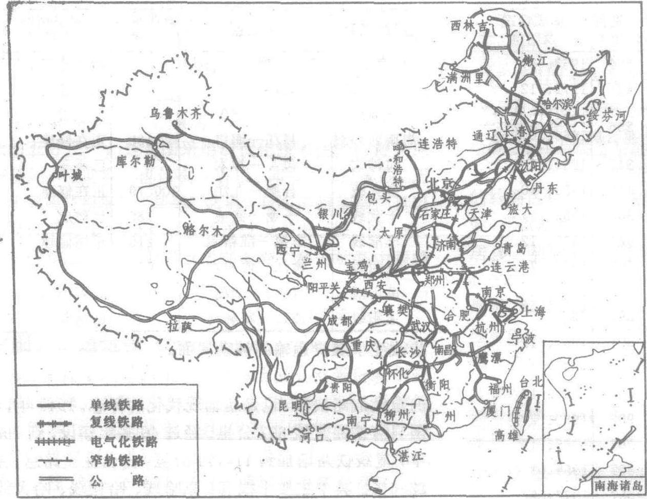 中华人民共和国成立后,铁路运输得到了很大的发展,初步改变了旧中国铁路数量少、质量差、分布不平衡的局面,铁路通车里程由2万多公里增加到5万多公里。现在除西藏外,全国各省区都通了铁路。40年来,根据国民经济发展的战略布局,有计划修建了沟通各个地区之间的铁路,促进了经济文化的交流。我国西南地区,山险水急,交通十分闭塞,1950年开始便修建成渝(成都—重庆)铁路,1952年通车,使我国的粮仓——成都平原和长江干流连接起来;1956年又修通了宝(鸡)成(都)铁路,使西南的铁路和全国铁路网相衔接;60年代后陆续又建成了川黔(贵阳至重庆)铁路、贵昆铁路、襄渝(襄樊到重庆)铁路,还将黔桂铁路从都匀延伸到贵阳。这些铁路形成了云、贵、川三省的铁路网骨架,并与全国铁路网相连接,西南地区交通闭塞状况得到显著改善。我国西北地区,中华人民共和国成立前只有陇海线潼关至天水一段铁路,并且质量低劣,时停时运。新疆、青海、宁夏等许多省区没有一寸铁路,为改变西北交通落后状况,我国于50年代初期就开始整治宝鸡——天水铁路,并修建了天水——兰州的铁路,使陇海铁路从东海之滨直达甘肃省会兰州。以后又相继建成了兰青(兰州至西宁)、兰新等铁路。过去不通火车的兰州从此成为西北地区铁路的枢纽,从兰州往北还新建了包兰铁路与京包线相连。在兰新线途中还分支了一条沟通天山南北的南疆铁路(现已由吐鲁番修至库尔勒)。西北地区的铁路建设对大西北的开发和建设起到了重大作用。在铁路网向西部地区展开的同时,东部地区铁路网布局也得到改善。在华东、华北、东北、中南等人口密集、经济发展水平较高的地区,一方面积极改造原有铁路,另一方面也修建了一些干线和支线,以增加运输能力。主要有横越武夷山脉,从江西通往福建的鹰(潭)厦(门)铁路、来(舟)福(州)铁路;连接安徽、江西的皖赣(芜湖到贵溪)铁路;与京广线平行、纵贯南北的太原—焦作—枝城—柳州太焦枝线;连接华北与东北,与京山线平行的北京至内蒙古通辽的京通铁路;穿越内蒙古草原,通向边疆的集(宁)二(连)铁路;从内蒙古直达大庆油田的通(辽)让(湖路)铁路;还修建了包头至白云鄂博、嫩江至古莲、蓝村至烟台等一些通往矿山、林区和港口的铁路。近年来,又着重修建了山西煤炭外运的铁路,北京直线至秦皇岛铁路已经通车,大同至秦皇岛电气化铁路正在修建。在修建新线的同时,还对旧线进行了改造和加强,对运量增长较大、运输能力紧张的线路和区段,修建双线和实现电气化。双线铁路已由1952年的1410公里,增加到1988年的11771公里;电气化铁路从无到有,宝鸡至成都、宝鸡至兰州、阳平关至安康、襄樊至达县、石家庄至太原、北京至秦皇岛等铁路都已实现了电气化。1988年年底,全国电气化铁路已达6185公里,占全国铁路运营总里程的11.68%。