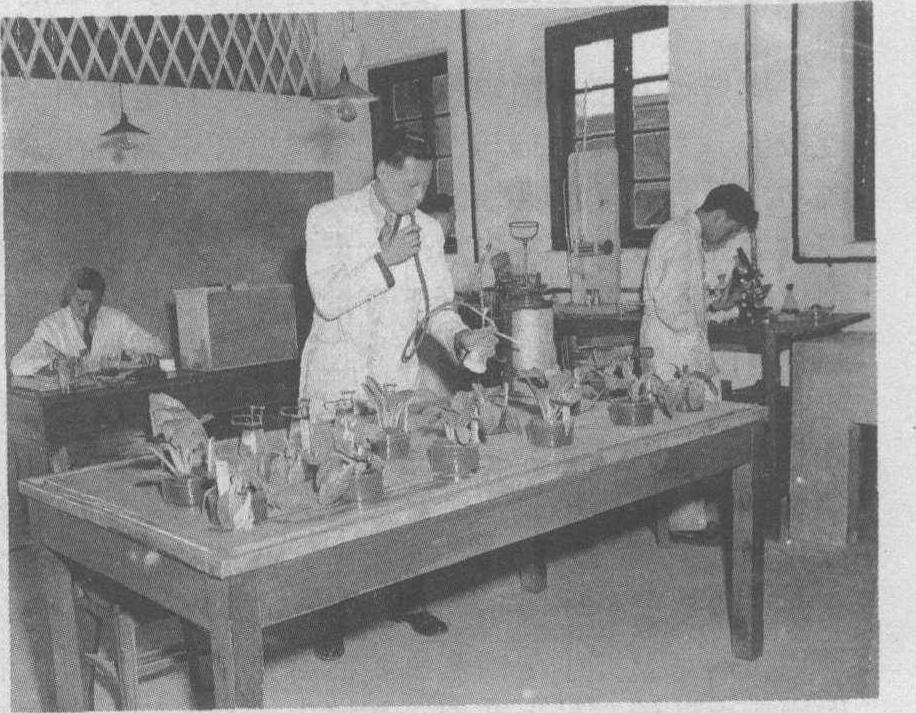 1937年7月7日,日本帝国主义者向中国发动大规模侵略战争。南京政府西迁四川,中央农业实验所、中央研究院及部分高等院校迁移西部,分散于西北、西南各地; 敌占区各省的科研、教育组织,转入敌后,从而形成了一个多部门、多学科纵横交错的工作环境。中央农业实验所病虫害系,根据该所的总体安排,将技术人员分派到战时建立的四川、贵州、广西、湖南、云南工作站,结合各省农业改进所或农事试验场,会同农产促进委员会(后改为农林部农业推广委员会)、农林部各省农业推广繁殖站,向西部开拓农业昆虫的研究与防治。未设工作站的省份,如陕西、甘肃、西康诸省,则派驻技术人员或派员作短期调查。转移敌后工作的人员,也在非常艰难的条件下进行工作。中央研究院动物研究所、中国科学社生物研究所,以及清华大学、金陵大学、浙江大学、中央大学等一批著名的高等学府迁入内地以后,仍继续开展农业昆虫研究。 农业昆虫研究在西迁中的进展 这一时期取得的主要成果有: ❶对内地11个省22种农林植物害虫的发生情况,8省和部分西迁高等院校所在地的害虫发生情况,6省积谷制度、仓库设施和仓库害虫种类与发生情况,有比较全面的了解; 对主要农业害虫及其天敌昆虫,结合研究,作了较深入的调查。 ❷过去东部地区行之有效的害虫防治技术,推向西部地区。在推广应用中,联系不同地区的具体条件,加以提高改进,又丰富了对中国农业昆虫问题的认识。 ❸明确了西部地区主要害虫的防治决策。四川南部与西部自然环境与水稻耕作制度不同,治螟策略应各有不同。过去重视川西,忽视川南的倾向得到纠正。川南中稻以防治二化螟为主,晚稻为三化螟。贵州水稻的主要虫害,是稻弄蝶幼虫。广西水稻主要害虫为稻苞虫、三化螟、稻瘿蚊、粘虫(广东、广西称剃枝虫)分布区域不同,防治各有侧重。玉米是广西第二作物,玉米螟害是影响产量的主要因素,调节播种期,可以避免为害,又不影响产量; 提倡彻底烧毀残株,或提前用作饲料。广西大豆歉收,虫害是主要原因。云南木棉的主要虫害是红铃虫,发生规律与陆地棉不同,防治措施相应有别。陆地棉“火风病”是叶蝉、蓟马所造成。长江流域陆地棉与中棉的僵烂铃率不同,其产生原因,虫害第一,病害次之,虫害以红铃虫关系尤大。 ❹从广西玉米螟研究中,较早地提出防重于治的概念。结合水稻栽培、土壤肥料、稻螟三方面分析,认为云南在水稻正常生长期范围内移植,合理安排施用氮肥的数量、方式、时期,可以避免螟虫为害。四川南部水稻成熟后,有两次刈劈遗株的习惯,总结经验,改良劈刀,推动越冬治螟。仓库害虫研究,紧密结合金融系统的农本局仓库和地方系统的粮食仓库,推动仓储管理制度,引用近代防治技术,试用熏蒸处理,改良积谷方法。对长期影响四川蚕丝,甜橙生产而被忽视的桑木虱和橘大实蝇,提出可行的防治方法,抑制了蔓延。从棉花生长期8种主要棉虫先后发生的整体出发,试验分析对产量的影响,提出了棉虫调查测算损失的方法与公式。初步探索食菌瓢虫及引用大突肩瓢虫试验防治甘蔗绵蚜。 ❺五倍子从过去侧重化学、植物学研究转向昆虫学研究,揭示了蚜虫种类与寄主之间的关系。对中国西南部白蜡虫产殖情况作了全面考查;对雄虫泌蜡习性、寄生树种、死亡原因作了系统研究;在紫胶虫的研究上,考查了产胶区的地理范围以及云南产胶区域。 杀虫药剂的研究与制造 包括:土法批量生产中农砒酸钙及砒酸铅试制;利用牛胶和无患子改进制成硬水植物油乳剂,以及植物油钠皂;改进广西土产烟草制剂的几种方法; 采用四川土制打铜皮和竹管制成的单管喷雾器,缓解了战时药械的紧缺状况。杀虫植物的利用,普遍受到注意。对西南各省的杀虫植物,进行了一次较全面考查,发现荳薯种子有触杀、胃毒及拒避作用,分析鉴定其有毒成分为鱼藤酮类化合物;厚果鸡血藤(俗名冲天子)种子兼具接触、胃毒杀虫作用;广西柳州引种毛鱼藤繁殖成功;国产除虫菊杀虫有效成分含量的分析及其与毒力的关系测定;应用光谱学研究鱼藤酮;还研究砒酸二铅、砒酸三铅、砒酸二钙、砒酸三钙等4种砒素剂的制造方法;试验制造硫酸铜、碱式硫酸铜、硫磺粉、可湿性硫磺粉、氯化苦、硫酸烟碱等,探索扩大产品的途径;探究波尔多液防治棉叶蝉的杀虫作用机理,充实对波尔多液防病治虫的认识。 治虫药剂药械制造厂的诞生 中国从20年代开始,运用近代科学知识研制自然农药,试制治虫药剂器械,30年代初仿制与自行设计并进,40年代初开始进入小型工厂化生产阶段。1943年,重庆政府成立农林部病虫药械制造实验厂(图4),为发展中国农药、药械工业迈出了重要的一步。在其前后设立的还有四川省农业改进所植物病虫药剂制造厂,以制造杀菌剂为主;浙江省农业改进所杀虫药剂制造厂。广东省农林局病虫室调制杀虫植物农药分发给农民;福建省有关部门委托工厂仿制各种喷雾器、撒粉器供城乡应用。