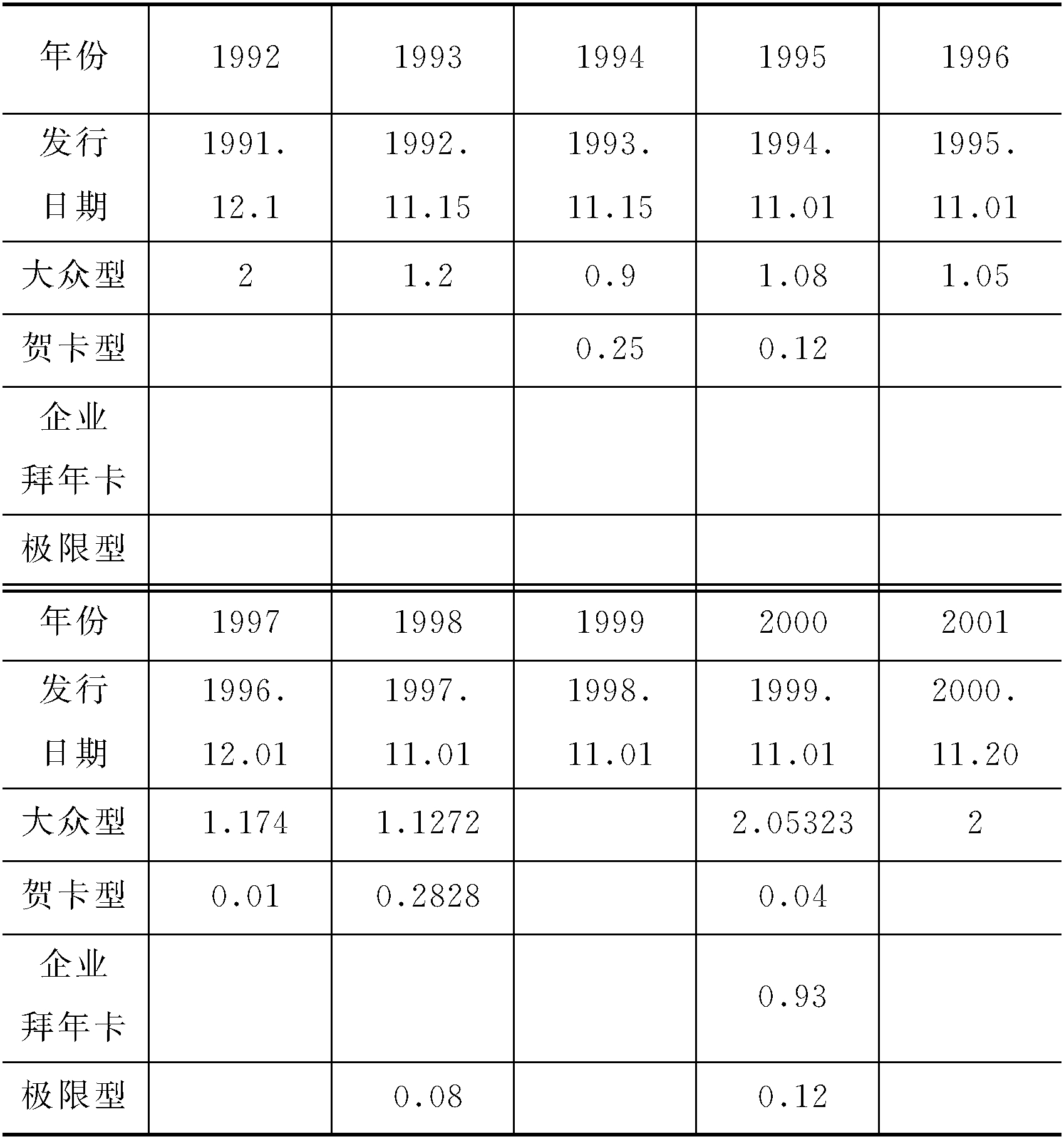 1991年12月1日开始发行。历年类型、印量(亿枚)如下表: