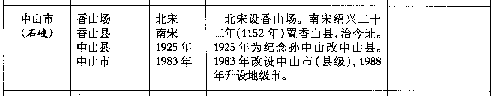 中山市(石岐)香山场香山县中山县中山市北宋南宋1925年1983年北宋设香山场。南宋绍兴二十二年(1152年)置香山县,治今址。1925年为纪念孙中山改中山县。1983年改设中山市(县级),1988年升设地级市。
