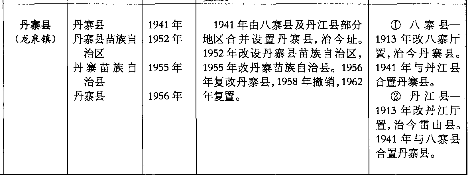 丹寨县(龙泉镇)丹寨县丹寨县苗族自治区丹寨苗族自治县丹寨县1941年1952年1955年1956年1941年由八寨县及丹江县部分地区合并设置丹寨县,治今址。1952年改设丹寨县苗族自治区,1955年改丹寨苗族自治县。1956年复改丹寨县,1958年撤销,1962年复置。❶ 八寨县—1913年改八寨厅置,治今丹寨县。1941年与丹江县合置丹寨县。❷ 丹江县—1913年改丹江厅置,治今雷山县。1941年与八寨县合置丹寨县。