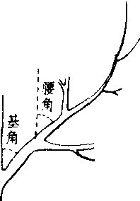 主枝分枝角scaffold limb angle果树主枝与树干所形成的夹角。其大小影响树势、结果早晚、产量、主枝牢固性和冠内的透光度等。角度小时,树势强,树冠郁闭,易致上强下弱,花芽形成少,结果期晚,产量低,主枝易劈裂;角度大时,树姿开张,生长势弱,早期产量较高,但易早衰,且副主枝易直立,徒长枝多。主枝分枝角大小因种类、品种、整枝形式而异。一般主枝基角在30°~70°范围内,腰角以60°~70°为宜,梢角应小些。在分层形树形中,下层分枝角应大于上层的。多数幼树主枝角偏小,应在早期调整使其开张。