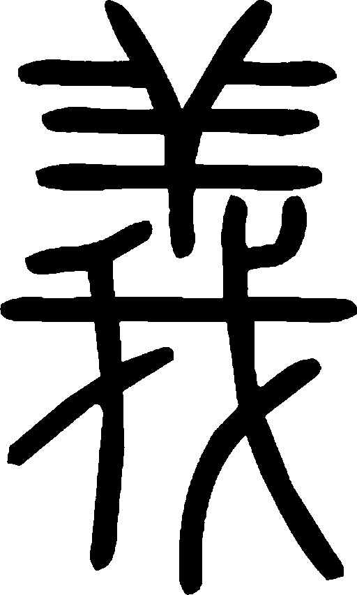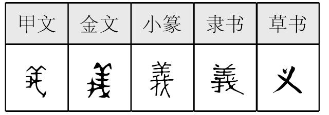 yì表意,小篆从我从羊,我为人的自称,指人,羊指美善,隶定为“義”。(一说形声,从羊,我声。)本义表示仁义,即人所表现的美善,引申为正义(公正而合乎道理)、合乎正义或公益的、意义、情谊、因抚养或拜认而成为亲属关系的、人工制造的等。宋元时期俗字简作“乂”(yì),用同音字代替;《简体字表》、《简化字表》为跟原字相区别,又添一点作“义”。 【辨析】 ❶以“义”作音符构成的形声字一般读yi,但声调不同。yì:议∣yí:仪∣yǐ:蚁、舣。 ❷“义(義)”可作类推简化偏旁使用,如:议(議)、仪(儀)、蚁(蟻)。 ❸义/意 “义”指内容或内中含有的意义,属于客观存在的,所指范围较窄、较小,如“本义”指字、词本来的意义,“含义”指字、词包含的意义,“望文生义”指从字面上强加附会,未能推求词句的确切含义;“意”指意思或想要表达的,存在于内心,属于主观的,所指范围较宽、较大,如“本意”指原来的意思或意图,“含意”指话语、诗文篇章包含的意思,“词不达意”指词句、言语不能完全表达想说的意思。 ❹义/宜/谊 见495页“宜”。义 義; 甲 金 篆 隶yì【析形】形声字。古文字形从羊,我声。 【释义】《说文》:“己之威仪也。”解释的是引申义。本义指符合正义或道德规范。《论语·述而》:“不义而富且贵,于我如浮云。”引申指符合正义或道德规范的道理或举动,这个意义后来写作“仪”。由符合规范引申为合适,适宜。所符合的道德标准,就是正义、道义。《左传·隐公元年》:“多行不义必自毙。”意思是违反正义的事干多了,必然自取灭亡。《孟子·告子上》:“生亦我所欲也,义亦我所欲也。二者不可得兼,舍生而取义者也。”这句话后演化为成语[舍生取义]。也引申指人与人之间的友爱之情,即情义,如成语[忘恩负义]。又可以用来指意义、含义。 【shape analysis】It is the pictophonetic character.In ancient character,the meaningful part is羊(yáng,sheep)and the phonetic component is 我(wǒ). 【original meaning】Conforming to justice or ethics. |
