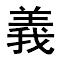 (章) ☚ 品德 诚 ☛ 义 义yì❶美,善。《大雅·文王》七章:“宣昭义问,有虞殷自天。”毛《传》: “义,善。”问,通“闻”,声誉,名声。义问,好声誉。马瑞辰《通释》: “义问,犹令问,嘉问。《字通》作 ‘闻’。《说文》: ‘闻,知声也。’ 引申之为声问。” ❷义,通“宜”。合适,公正。《大雅·荡》三章: “而秉义类,强御多怼。”郑《笺》: “义之言宜也。类,善。”宜,适宜,合适,引申为公正。义类,正直善良。 ❸通“宜”,应当。《大雅·荡》五章:“天不湎尔以酒,不义从式。” 毛《传》: “义,宜也。”陆德明 《释文》: “饮酒齐色曰湎。” 《韩诗》:“饮酒闭门不出客曰湎。”郑《笺》:“式,法也。”孔《疏》: “汝君臣何为耽荒如是,天不湎然同汝颜色以酒,汝乃自耽于此酒使色同耳,此乃过误之事,不宜从而法行之。” ☚ 川之流 夕 ☛ 义读音·i(ˋ),为i韵目,属i—er韵部。宜寄切,去,寘韵。 ❶正义;道义。 ❷意义;意思。 ❸礼仪。 上一条: 蓺 下一条: 義 义〔yi〕 nib:意~。yib nib. 义義ㄧˋyì一0383动推辞。冀鲁官话。山西广灵〖i213〗。~不过‖~得过。   义yi正确的道德、行为或道理。《左传·隐公元年》:“多行不~必自毙。”(不义:不合道义的事。)《论语·述而》:“不~而富且贵,于我如浮云。” 义❶〈隐〉清末以来湖南长沙盐业指数目四。参“乙、兜、先、义、潘、炭、柴、哈、曲”。 ❷〈隐〉旧时安徽帮会指数目七。参“才、元、汉、江、水、仁、义、楚、云、山”。 义義yì❶公正的、有利于社会大众的道理 △ 道~|见~勇为。 ❷符合正义或大众利益的 △ ~举|~战。 ❸意思;意义 △ 一词多~。 ❹拜认的(亲属关系) △ ~父|~子。 ❺人造的(人体的某一部分) △ ~齿|~肢。 ❻人与人之间的感情 △ 有情有~。 【注意】笔顺为: 。 义義❶公正合宜的道理或行动:~务︱~气︱~愤︱~举︱~旗︱~勇︱~师︱~战︱~士︱~演︱~卖︱~学︱~塾︱~地︱~冢(zhong)︱仁~︱正~︱信~︱道~︱大~︱起~︱举~︱首~︱侠~︱演~︱市~︱~不苟取︱~不容辞︱~正词严︱~愤填膺(ying)︱~形于色︱~无返顾︱仁~道德︱大~凛(lin)然︱见~勇为︱大~灭亲︱不~之财︱仗~疏财︱仁至~尽︱见利忘~︱背信弃~︱从(cong)容就~︱天经地~︱舍生取~︱成仁取~︱急公好(hao)~︱言不及~。 ❷人与人之间的情谊:情~︱无情无~︱忘恩负~。 ❸拜认的亲属关系:~父︱~子︱~女︱结~。 ❹人工制造的:~齿︱~肢。 ❺意思;意义:~理︱~项︱定~︱本~︱要~︱疑~︱字~︱词~︱广~︱狭~︱含~︱涵~︱音~︱释~︱讲~︱教(jiao)~︱歧(qi)~︱褒丨(bao)~︱贬~︱转(zhuan)~︱顾名思~︱断章取~︱微言大~︱开宗明~。 义yì❶ 正义:道义︱义正词严。 ❷ 符合正义或大众利益的:义战︱义卖。 ❸ 意义,含义:字义︱同义词。 ❹ 情义:忠义︱信义︱有情有义。 ❺ 因抚养或拜认而形成的亲属关系:义子︱义母。 ❻ 人体中人工制造的:义齿︱义肢。 ❼ 姓。 义yì正义,公正合理。《离骚》:“夫孰非义而可用兮。” 义指阐述经书义理。 如 《礼记》 之 《祭义》、 《冠义》、《昏义》《乡饮酒义》诸篇,都是说明礼的义理的,后世注解的书, 亦多以 “义” 为名。 如汉代王玢 《春秋左氏述义》等。 六朝以后, 专指解注的 “义疏”。 如何修 《礼记义》、 巢猗 《尚书义》 等。 义yi义仓1 义齿2 义地3 义工 义举 义军 义理 义卖 义拍义旗 义气 义赛4 义师 义士 义塾 义务 义项 义学 义演义勇 义战 义诊 义肢5 褒义 本义 贬义 大义 道义 定义广义 含义 讲义 教义 结义 就义 名义 歧义 起义 情义 仁义 释义 首义 侠义 狭义 信义 演义 要义 疑义 意义 音义正义 主义 转义 义和团 义务兵 义勇军 义不容辞 义胆忠肝义愤填膺 义无反顾 义务教育6 义务劳动 义形于色 义正词严爱国主义 霸权主义 保守主义 背信弃义 本本主义 本位主义 存在主义 地方主义 帝国主义 断章取义 分离主义 分裂主义 封建主义 风头主义 改良主义 个人主义 功利主义 共产主义 古典主义 顾名思义 官僚主义 国际主义 机会主义 急公好义 集体主义假仁假义 教条主义 经验主义 军国主义 开宗明义 客观主义 恐怖主义 扩张主义 浪漫主义 利己主义 列宁主义 冒险主义 蒙昧主义 南昌起义 农民起义 平均主义 秋收起义 人本主义 人道主义 人文主义 三民主义 舍生取义 社会主义 实用主义 实证主义天经地义 投降主义 忘恩负义 望文生义 微言大义 唯我主义 唯物主义 唯心主义 武昌起义 现实主义 相对主义 写实主义 形式主义 修正主义 虚无主义 言不及义 殖民主义 中立主义 种族主义 主观主义 资本主义 自然主义 自由主义 宗派主义 义和团运动 义务兵役制 达尔文主义 法西斯主义 马克思主义 无政府主义新殖民主义 辩证唯物主义 革命浪漫主义 革命乐观主义 革命现实主义 个人英雄主义 国家资本主义 机械唯物主义 科学社会主义客观唯心主义 空想社会主义 历史唯物主义 历史唯心主义 垄断资本主义 贸易保护主义 批判现实主义 右倾机会主义 主观唯心主义左倾机会主义 马克思列宁主义 义yì❶正义;道义:愚虽不才,“~利”二字却还识得。(一·18)探春笑道,“虽如此,只怕他们见利忘~。”(五六·1317) ❷情谊:他也是个极多情的,遂也投河而死,不负妻~。(十六·320) ❸意义;旨趣:若要随人脚踪走去,纵使字句精工,已落第二~,究竟算不得好诗。(六四·1542)