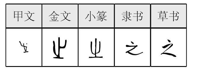 之 甲骨文; 金文; 篆zhī[象形,像人動脚向前走。(《説文》:“之,出也。象艸過屮,枝莖益大,有所之。一者,地也。”不確。之,助詞〈赤子之心。緩兵之計,不速之客〉;用在主謂結構之間〈大道之行也,天下爲公〉;代詞〈置之度外〉;虛用〈久而久之〉;到〈吾欲之南海〉。甲骨文“之”從止從一,像人向前方出走。)] 《詩經·秦風·蒹葭》:“溯洄從之,道阻且長。”(逆流而上去找她,河道險阻漫且長。) 之(zhī)“ ,出也。象艸过屮,枝茎益大,有所之。一者,地也。凡之之属皆从之。”(止而切) 徐锴《系传》:“之者,枝也。象艸木之枝东西旁出而常连于根本也。”《说文》以“出”释“之”,意为生长出来。许慎根据讹变的字形,加以训释。甲骨文作 ,从人足在癅上,表示离开一个地方前往他处。《尔雅·释诂上》:“之,往也。”卜辞或用其本义,如:“甲戌卜,王之以射?”(《英》526)[1]卜辞中“之”还被借用为指代词,如:“辛酉卜,……翊壬戌不雨,之日夕雨,不延。”(《乙》5278)[2]金文作 、 、 ,用为第三人称代词,如齐镈:“ 氏易(赐)之邑 (二百)又九十又九邑。”也用作指示代词,此,这,如何尊:“余其宅兹中或(国),自之 (乂)民。”[3]文献中“之”多被借用为语助词,参见王引之《经传释词》卷九。 之部只有一个属字“ ”,云:“艸木妄生也。从之在土上。读若皇。” 之zhī(3画)