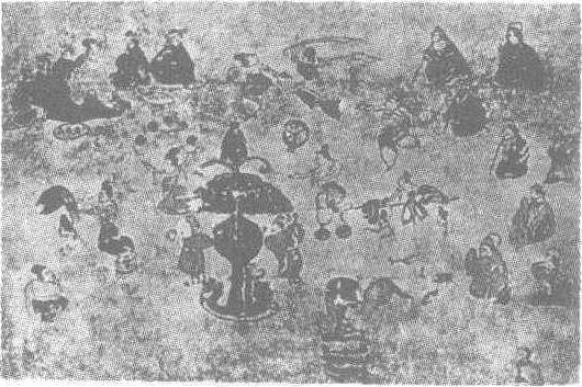 东汉晚期。纵180厘米,横110厘米。1972年内蒙古自治区和林格尔县新店子1号墓中室北壁右下角壁画。画面偏左为高大建鼓,建鼓两边各有一人,戴冠,着红衣,正在执槌擂鼓。右侧为伴奏的乐队,有的吹埙,有的吹萧,有的敲打乐器,在乐队和鼓的伴奏下若干人表演着百戏舞蹈,有跳丸、舞轮、飞剑、橦技、倒立等。表演者动作灵巧,技艺精绝,场面十分紧张热烈。不远处一束髻裸上身的男子与一执飘带的婀娜女子翩翩起舞。画面左上角有六位观赏者。座前放置有食物的三足镟和耳杯。整个画面线条流畅,色彩明丽,人物形象生动,是汉代墓室壁画中的优秀之作。