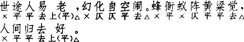 △。《北曲新谱》谓:“此章音节以拗为胜”,“改拗为顺,与本调特点不合,不宜从。”首末两句有叶去声韵者,二、三两句有叶上声韵者;白朴《墙头马上》首句不叶韵,吕止轩“半生花柳”套第三句不叶韵;《新谱》谓“俱不宜从”。罗振玉藏明抄残存六卷本《阳春白雪》马致远〔夜行船〕“帘外西风”套第三句“孤帏难捱今夜”,改为六字句,首四字连用平声,极少见。元刊本《七里滩》有〔乔牌儿〕两支,其第一支即“辇路旁”曲,第四句“碧云间将雪翅开”下,缺题〔挂玉钩〕牌名;下文自“它直飞到皇宫探我来”,至末句共八句为〔挂玉钩〕。散套首牌。亦常作套数次牌。幺篇同前篇,用者甚少。同诸宫调,其第三句可不叶韵。〔乔牌儿〕用作散套首牌者,只有关汉卿“世情推物理”套、马致远“世途人易老”套、乔吉“凤求凰”套,共三套。