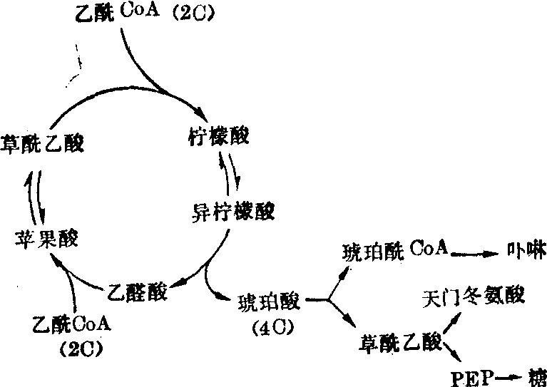 释义 | 乙醛酸循环glyoxylate cycle由2分子乙酰CoA净合成1分子琥珀酸,并形成中间物乙醛酸的一种循环代谢途径。其过程为乙酰CoA首先与草酰乙酸缩合成柠檬酸,进而转变为异柠檬酸,再裂解生成琥珀酸和乙醛酸,后者与另一分子乙酰CoA缩合为苹果酸,最后再生成草酰乙酸。各步反应均需相应的酶催化。异柠檬酸裂酶和苹果酸合酶是该循环的关键酶。在植物的萌发种子细胞内的乙醛酸体中进行,是脂肪中的脂肪酸转变为糖的必经途径。也在某些微生物体内进行。在动物组织中尚未发现。 乙醛酸循环glyoxylate cycle系一种改变的三羧酸循环。与三羧酸循环不同的是从异柠檬酸转变为乙醛酸及琥珀酸,一分子乙酰辅酶A又与乙醛酸缩合转变成苹果酸,再脱氢形成草酰乙酸,循环中消耗2分子乙酰辅酶A,产生1个分子琥珀酸。 乙醛酸循环可看作三羧酸循环的支路。由于异柠檬酸裂解酶和苹果酸合成酶催化反应中产生乙醛酸中间物,反应的结果使三羧酸循环发生了改变,故名。存在于植物和微生物体内。 乙醛酸循环 乙醛酸循环乙醛酸循环是植物及微生物细胞内另外一条糖代谢途径。某些细菌、藻类及有些高等植物在其生命周期的某个阶段,利用乙酸作为它唯一的碳源,以合成细胞内全部含碳化合物; 这一过程是通过乙醛酸循环来实现。 乙醛酸循环从2分子乙酸(乙酰CoA)生成一分子琥珀酸 与三羧酸循环反应过程相比较,异柠檬酸不是被氧化掉,而是被异柠檬酸裂解酶催化,裂解为琥珀酸及乙醛酸: ![]() ![]() ![]() ![]() ☚ 糖醛酸途径 糖原合成与分解 ☛ |