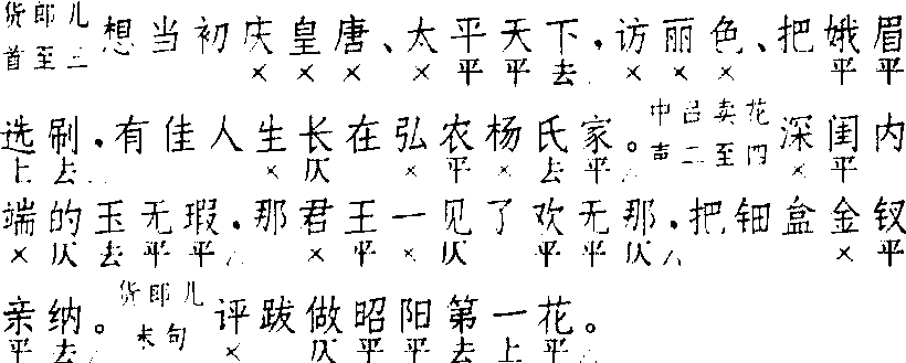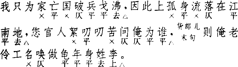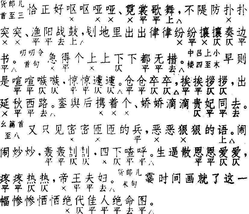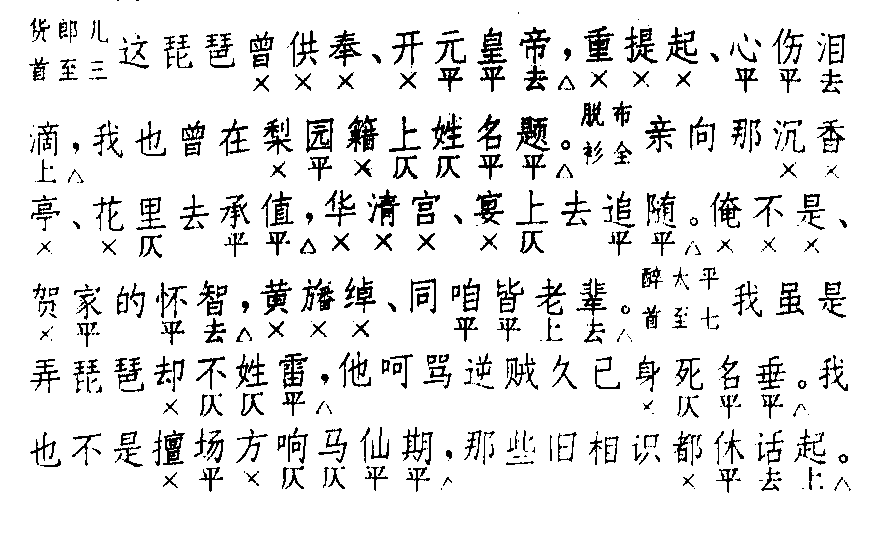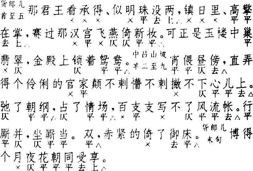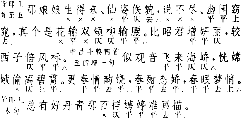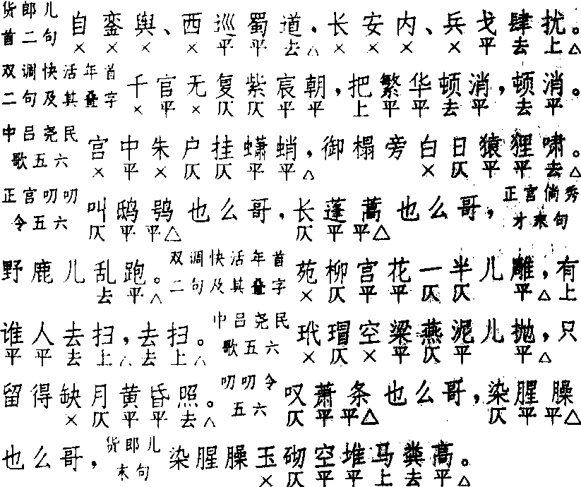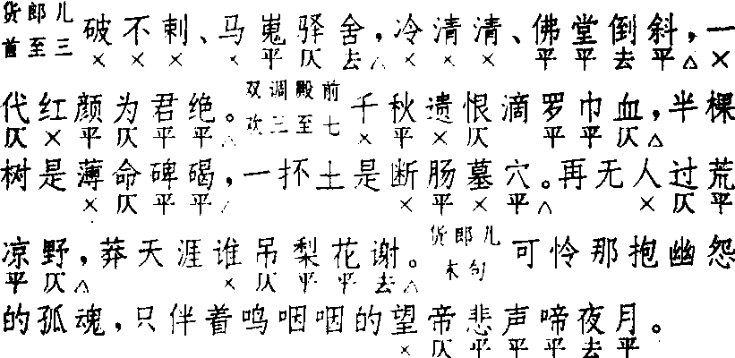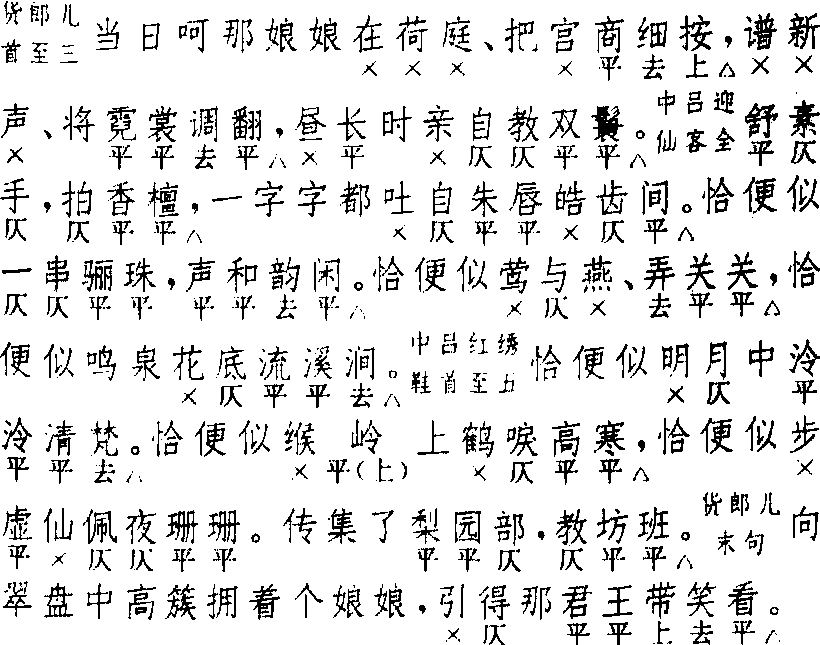 释义 | 九转货郎儿 九转货郎儿洪昇 《长生殿·弹词》 一转 ![]() 二转 ![]() 三转 ![]() 四转 ![]() 五转 ![]() 六转 ![]() 七转 ![]() 八转 ![]() 九转 ![]() ![]() 〔九转货郎儿〕创自元无名氏《货郎旦》杂剧,原题〔转调货郎儿〕,自第二曲起,分别题〔二转〕至〔九转〕。《正音谱》题〔货郎儿〕,下注“计九转”。《广正谱》始题为〔九转货郎儿〕。首曲为〔货郎儿〕本格,第二至第九曲方为转调,所转各曲均为〔正宫〕及借入〔正宫〕之〔中吕〕、〔双调〕各曲。实际写作时,首曲直接总题〔转调货郎儿〕之下,不写“一转”字样。曲谱题“一转”者,只为计数方便而已。转调为一种集曲方式,〔九转货郎儿〕实为一种结构固定的集曲套。《货郎旦》[九转货郎儿〕用在〔南吕〕套〔一枝花〕、〔梁州第七〕之后,〔尾声〕之前,成为套包套的特殊套式,即〔南吕〕套包〔正宫〕套的套式。〔一枝花〕、〔梁州第七〕及〔尾声〕三曲,本为〔南吕〕套的原始简单形式,按一套一韵的成规,自须一韵到底。而此包入之〔正宫〕套〔九转货郎儿〕自可不必与之同韵,九转各曲可随意换韵,实为联套中的变例。明初朱有燉《义勇辞金》剧第四折为〔正宫〕套,〔端正好〕、〔滚绣球〕、〔倘秀才〕之后,接用〔转调货郎儿〕九曲,以〔煞尾〕结束。转调九曲顺序与《货郎旦》相同,惟第五、六、七转所转各曲有异。《货郎旦》转调九曲,离开本折剧情另叙一段故事,以〔正宫〕套插入〔南吕〕套中,转调九曲故不必与〔南吕〕套同韵。《义勇辞金》则作法不同,同属〔正宫〕曲,所演情节为故事本身之自然发展,非同《货郎旦》之套包套,自应一韵到底;而实际情况却不然,九曲中只首曲及九转与全套同韵,其二转至八转则随意换韵,与《货郎旦》同例,以致依违两可,进退失据。《义勇辞金》套式从来未见仿用。《货郎旦》套式自《长生殿》仿用之后,大为盛行。蒲松龄《闱窘》杂剧附〔九转货郎儿〕散套,与《长生殿》时代最为接近。唐英《女弹词》(见《古柏堂戏曲集》),改为李龟年女弟子旦唱。以后仿作者益多。郑骞辑《九转货郎儿集》(载《景午丛编》上编)收七家,郑氏亦作有《李师师》杂剧。此外尚有谢元淮《感怀》、孙为霆《自题巴山樵唱》两散套。前人曲谱皆用《贷郎旦》曲,今易以《长生殿》,所注转调小牌,皆取自郑骞《北曲新谱》而少有变动。 ☚ 转调货郎儿 煞 ☛ 九转货郎儿 九转货郎儿曲牌名。属北曲正宫。北曲正宫有 〔货郎儿〕 曲牌,字数定格及韵式作七、七、七、三、三、七 (六句)。该曲之变体为 〔转调货郎儿〕,首尾用〔货郎儿〕 本调,中间杂以其他曲牌数句。一般用在正宫套曲内,也用在南吕套曲内。元杂剧《货郎旦》第四折连用八个 〔转调货郎儿〕,连第一个〔货郎儿〕本调,称为 〔九转货郎儿〕。其字数定格及韵式,据清·周祥钰《九宫大成谱》作七、七、七、三、三、三、五(七句),与〔货郎儿〕略有不同。明清时期,不少剧作家都仿效此调,连用“九转”。如《长生殿·弹词》中李龟年回忆往事时所唱之九曲即是。 ☚ 黄龙滚 雁儿落 ☛ |