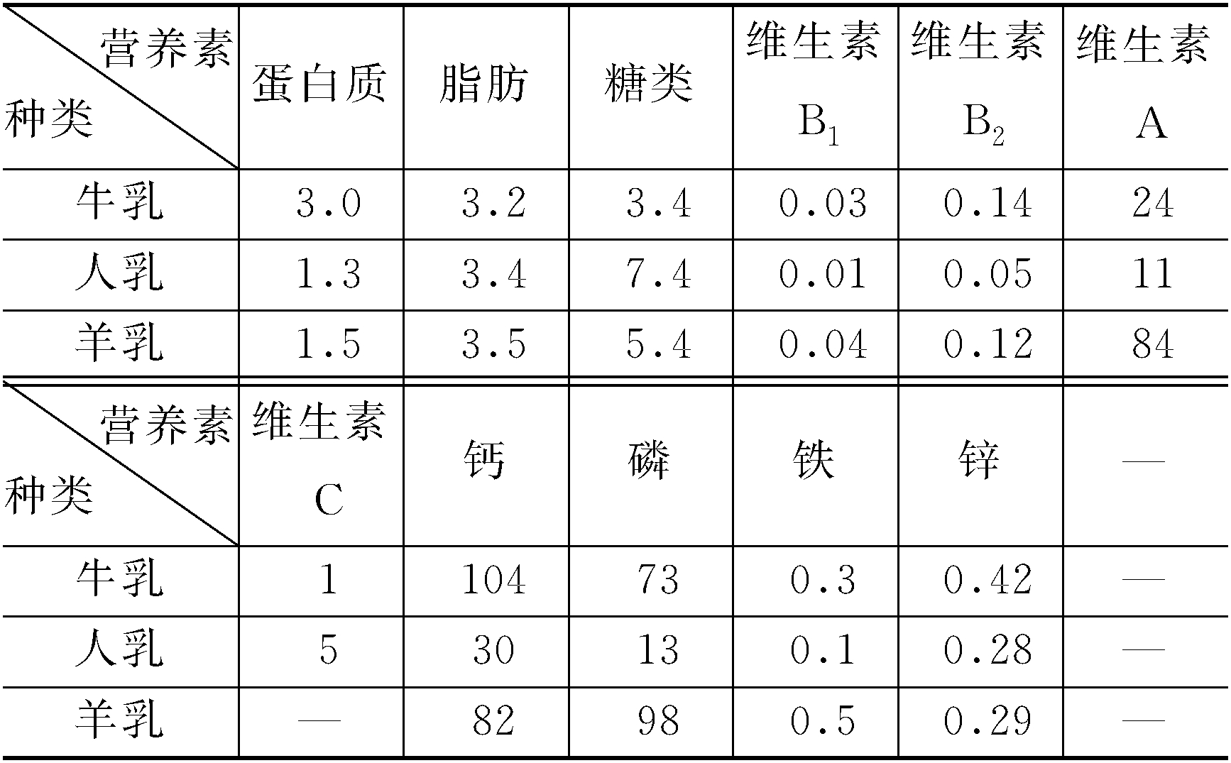 释义 | 乳类的营养素含量鲜乳一般含水87%~89%,含蛋白质3%~4%,含脂肪3%~5%,含乳糖4.5%~5%,含矿物质0.6%~0.75%,还含有少量维生素,见下表(以100 g计): 注:表中单位除蛋白质、脂肪为g外,其他均为mg。 |