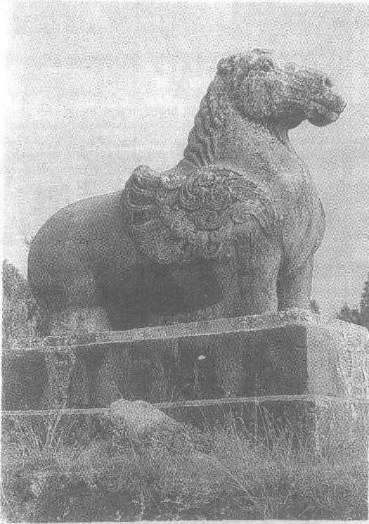 唐永隆元年至嗣圣元年(公元680—684年)。高335厘米、底座长298厘米。陕西省乾县梁山唐高宗李治和武则天合葬墓乾陵神道石像生。石灰岩质。马昂首挺胸,鬃毛绺绺垂披,双肩凸雕翻卷的波浪形羽翼,柱尾下垂,威然挺立。此翼马集写实性、理想性、装饰性于一体,身躯、四肢以夸张的手法雕得浑厚结实,羽翼刻得曲蜷适度,线条优美,富有韵律变化,是乾陵石刻中最具特色的作品。乾陵(见“乾陵”条目)是唐代保存石雕最多,最完整的帝陵之一,至今仍存有4对石狮、1对华表、1对翼兽、1对驼鸟、6对石马、5对牵马人、10对石人,61“蕃酋”像及石碑等。