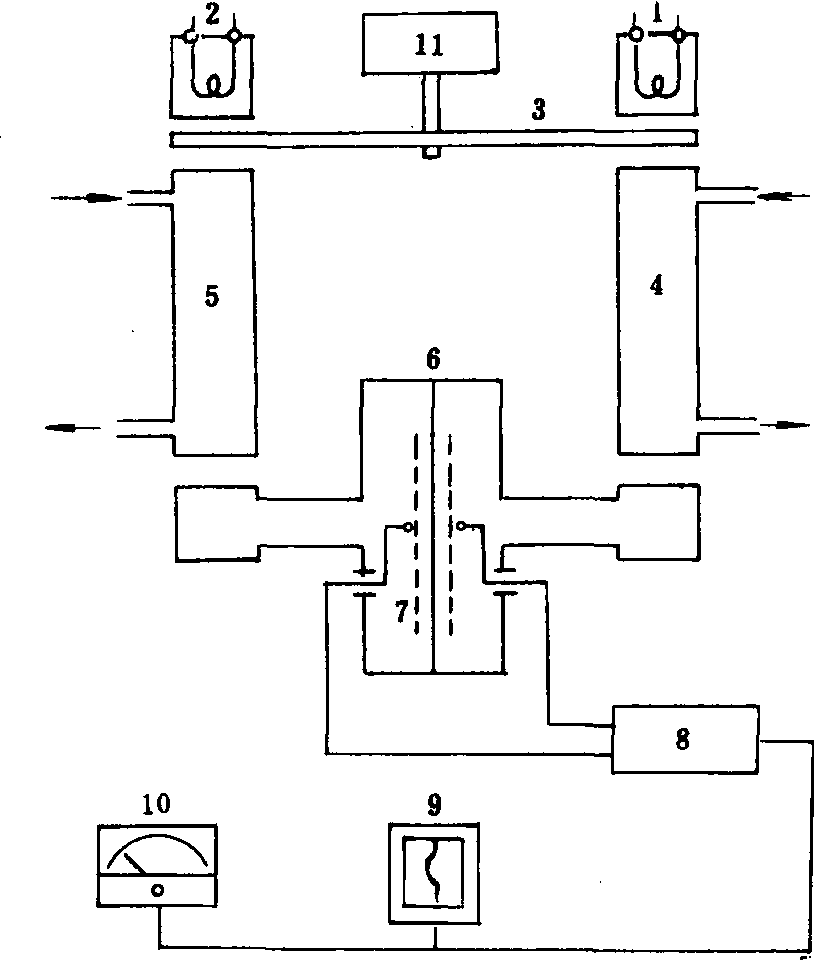 释义 | 二氧化碳红外气体分析仪eryanghuatan hongwai qiti fenxiyicarbon dioxi de infrared gas analyser利用CO2对红外光谱中某特定波长有强烈吸收能力的特性以测量植物气体环境中CO2浓度的仪器。可用于分析植物光合作用和呼吸作用, 也可测量动物的呼吸作用。普通大气中所含CO2的浓度约为320μl/L,在植物叶片光合作用旺盛时, 叶片周围空气中的CO2浓度远比这一数值低。因此, 需要用微量级的气体分析仪器来测定。过去主要采用普通的化学分析方法, 效率低, 不能连续测定, 也就不能很好地了解植物光合作用的整个过程。1890年左右F·帕馨等人发现CO2能吸收红外辐射这一特性后, 便采用红外气体分析仪来测定CO2的浓度。由于仪器的自动化程度高, 能够连续采样, 并能将CO2浓度的连续变化记录下来, 对研究光合作用非常有利, 现已普遍使用(见图1)。 图 1 CO2红外气体分析仪 原理 不同的气体分子, 对于红外辐射区有着不同的吸收特征波长。CO2气体对4.26微米波长红外辐射有强烈的选择吸收能力。这是因在4.26微米波长红外线作用下,CO2分子偶极子与之发生共振,因而能吸收这个波长的红外辐射。其他单原子(如H)及同原子分子(如N2、H2)则不存在振动偶极子,故不吸收红外辐射。当波长4.26微米的红外线通过含有CO2的空气时,部分能量被CO2吸收,能量的减少量可根据比尔定律(Beer’s Law)测定,即: E=E0×e-KcL(1) 或 △E=E0-E=E0(1-e-KcL) (2)式中 E0是入射前的红外辐射能量;E是被CO2吸收后的红外辐射能量:K是CO2气体的吸收系数:c是空气中CO2浓度;L是红外光线在气体层中通过的距离,对给定仪器为常量;△E只与CO2气体浓度c有关,如能测出△E值,即可求得CO2的浓度。 基本结构 一般可分为三部分,即光路部分、气样采集部分和电子放大显示部分。光路部分包括产生红外线的红外辐射源及信号调制器。气样采集部分包括测量气室和采样气路等。电子放大显示部分包括接收红外辐射的红外检测器、电讯号放大器、显示记录器等。 工作过程 仪器的作用是要测出△E值,以便能在显示器上直接读出空气中的CO2含量。按结构可分为双气路和单气路两类。 图2 双气路型CO2红外气体分析仪示意图 双气路型 图2中1和2表示两个波长和强度都相同的红外辐射源,一般由红外灯泡和光学滤光片组成。红外灯泡所产生的红外辐射,波长范围较宽,经过滤光片后,即变成了波长4.26微米的红外平行光束。红外光束1通过对比管到达检测器6,对比管4是密闭的,管内充满已知浓度的标准气体,例如纯净的N2。管内CO2浓度接近于零,不吸收4.26微米波长的红外辐射,因此检测器右边得到的能量相当于公式(2)中的E0。红外光束2通过试样管5时,一部分能量被流动空气样品中的CO2气体所吸收,因而到达检测器左边的能量,就相当于公式(2)中的E,显然检测器两边接收的能量不等,其差值相当于△E。检测器是个薄膜电容器,通过汇集膜7,它把△E变成电迅号,并送到信号放大器8加以放大,再经检波整流以后由显示器直接显示CO2的浓度。显示器可以是电流表或自记电位差计9,也可用数码显示10并配备数字打印机。旋转遮光器3是一块由同步电机11驱动、其扇形角为90°的双扇形黑色薄板,两扇形相距亦为90°,它以恒速转动,薄板转动一周使光路各通断两次。就这样把原来两个光路所形成的直流信号变成了断续的脉冲信号。因为放大交流信号比直流信号方便,也比较准确, 精度高。 单气路型 结构简单,体积和重量都小,便于携带,它只用一个气室和一个红外辐射源。红外源放在一个受同步电机带动的圆形调制筒内,筒上开有6个窗孔,沿圆周均匀分布,互差60°;孔上装有A、B两种滤光片各三片,A.B相间排列, A型片只允许4.26微米波长红外光通过: B型片只允许CO2不吸收的红外光通过。于是,当调制筒转动时,就会有CO2能吸收和不能吸收的两种红外光束交替通过测量气室,室内流动空气中的CO2将吸收其中一种光束的部分能量:因此,接收到的能量也交替为E和E0,其差值就是△E。所以, 调制筒每转一周,就可得到三个△E值。如此循环往复,可得到较为准确的CO2气体含量。 注意事项 ❶要除尘除湿。由于水汽分子是偶极子,也强烈吸收红外线,除湿不尽会严重影响CO2气体的测量准确度。尘埃中的杂质,有一些能吸收红外线,也会干扰测量结果。 ❷防止人为影响。人体在日常呼吸中呼出CO2,不注意也会影响测量结果。另外,还要注意空气密度变化对CO2浓度的影响。在精密测量时应考虑温度和气压的订正问题。 ❸经常注意仪器的校准。仪器在使用一段时间后,可能发生某些性能方面的变化,影响测量的准确度。 |