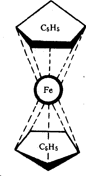 释义 | 二茂铁 二茂铁ermaotie又称二环戊二烯合铁。1951年P.L.保森为了制备富瓦烯,用三氯化铁氧化环戊二烯格氏试剂[(C5H5)—Mg—Br],结果未得到预期产物富瓦烯,却得到了一个橙色、稳定的新配合物(C5H5) 2Fe,称之为二茂铁。其反应历程是Fe3+首先被(C5H5)—Mg—Br还原为Fe2+,然后Fe2+与(C5H5)—Mg—Br反应生成(C5H5)2Fe。它有类似樟脑气味,熔点为172.5~173℃,100℃以上升华,沸点为249℃,有抗磁性,不溶于水,10%氢氧化钠和热的浓盐酸溶于稀硝酸、浓硫酸、苯、乙醚、石油醚和四氢呋喃等,在空气中稳定。进一步研究表明,它是过渡金属有机配合物中含有芳香性有机基团的一个代表性物质,具有特殊的化学稳定性,而且具有特殊的分子结构。X射线衍射分析指出,其偶极矩为零,其中C—H键全都相同,C—C键长为140 pm,而C—Fe键长为204 pm,两个环状C5H5基间的距离为332 pm。1952年E.O.费希尔和G.威尔金森同时确定该化合物具有新型的“夹心面包结构”,Fe原子位于两个环状C5H5的五边反棱柱排列之间 (见图)。由其分子轨道能级图可看出,二茂铁中Fe2+的6个价电子和两个C5H-5环的 12个电子,共18个电子,分别填入a1g,a2u,e1g,e1u,e2g,a1g分子轨道中,由于分子中无单电子存在,故二茂铁为抗磁性。此外,铁原子经两个茂基配位后,核外电子总数为36,相当于希有气体氪Kr的原子结构,完全符合E.A.N规则,相当稳定,1955年以后逐步发现了一系列类似的化合物,通称夹心结构化合物,其中的“心”指金属原子或离子,正如两个面包片 (指有机基) 间的肉一样,也称做茂金属化合物。二茂铁的合成,开辟了含有π键合的芳香环的过渡金属有机金属化学的新领域。有关的结构理论研究,推动了金属有机化学的迅速发展,对无机、有机化学和理论化学都产生了极其重大的影响。为此E.O.费希尔和G.威尔金森共同获得1973年诺贝尔化学奖。