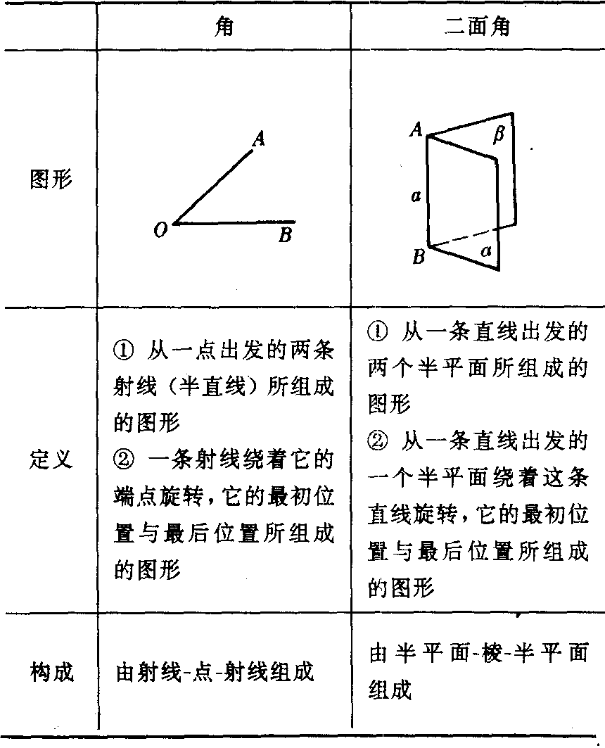 二面角反映了两个相交平面的相关位置.二面角是一种空间图形,它是平面几何中角的概念的拓广.二面角和角的概念对比如下表.