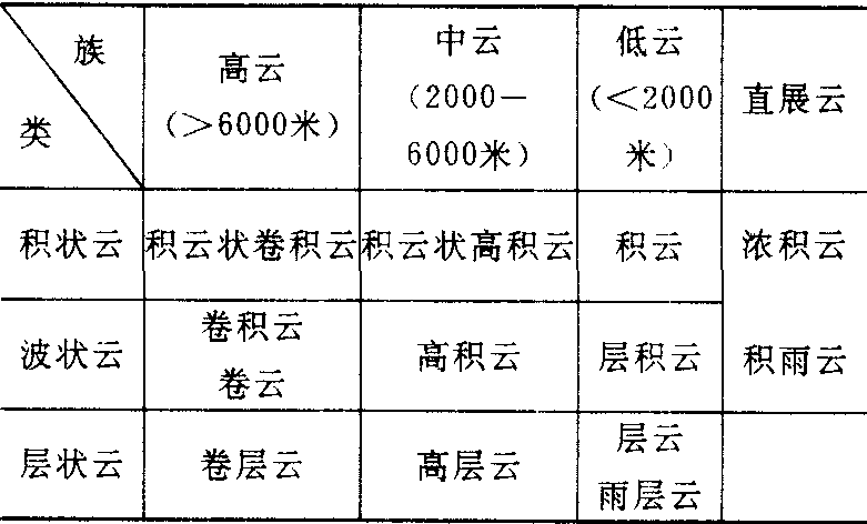 族 类 高 云 (>6 000米) 中 云 (2 000—6 000米) 低 云 (<2 000米) 直展云 积状云 积云状卷积云 积云状高积云 积云 浓积云 波状云 卷积云 卷 云 高积云 层积云 积雨云 层状云 卷层云 高层云 层云 雨层云