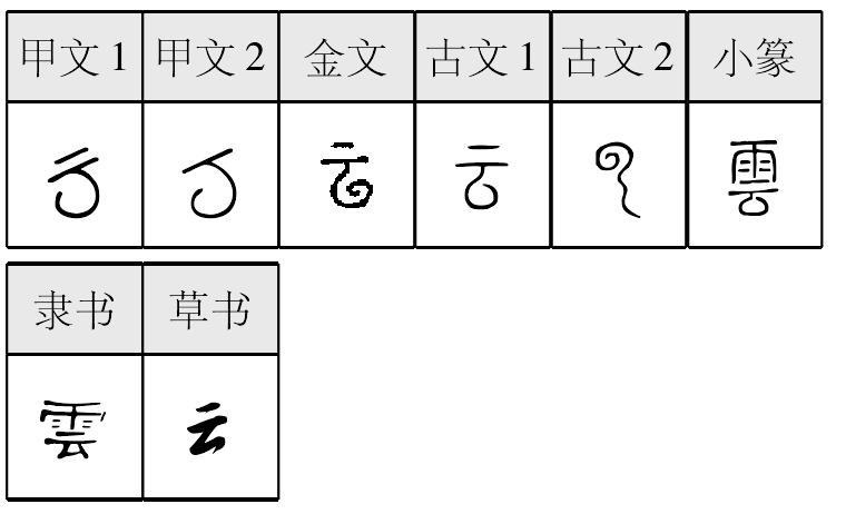 云 甲骨文; 篆yún [象形,像天上的白雲。(《説文》:“云,古文省雨。”解説有所顛倒。云因被借,而後造“雲”。云,“雲”本字。云,像水氣上升,遇冷凝結成形,薄雲白色〈白雲朵朵〉,厚雲黑色〈烏雲陣陣〉。因聲借爲“説”〈人云亦云、不知所云〉,或表示“有”“或許”“如此”。於是另造“雲”字。)] 《詩經·鄘風·君子偕老》:“子之不淑,云如之何!”(行爲亂糟糟,跟她没嘮叨!)