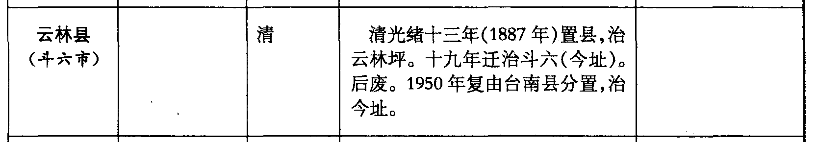 云林县(斗六市)清清光绪十三年(1887年)置县,治云林坪。十九年迁治斗六(今址)。后废。1950年复由台南县分置,治今址。